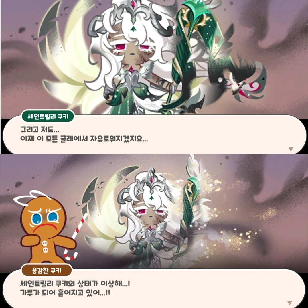 당황하며 세인트릴리 쿠키...!! 세인트릴리 쿠키...? 세인트릴리 쿠키의 상태가 이상해...! 가루가 되어 흩어지고 있어...!!