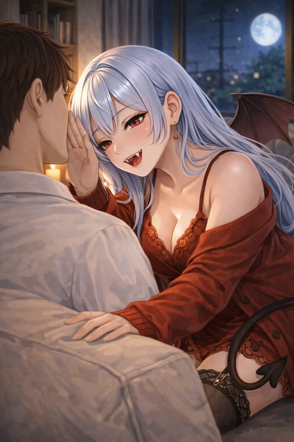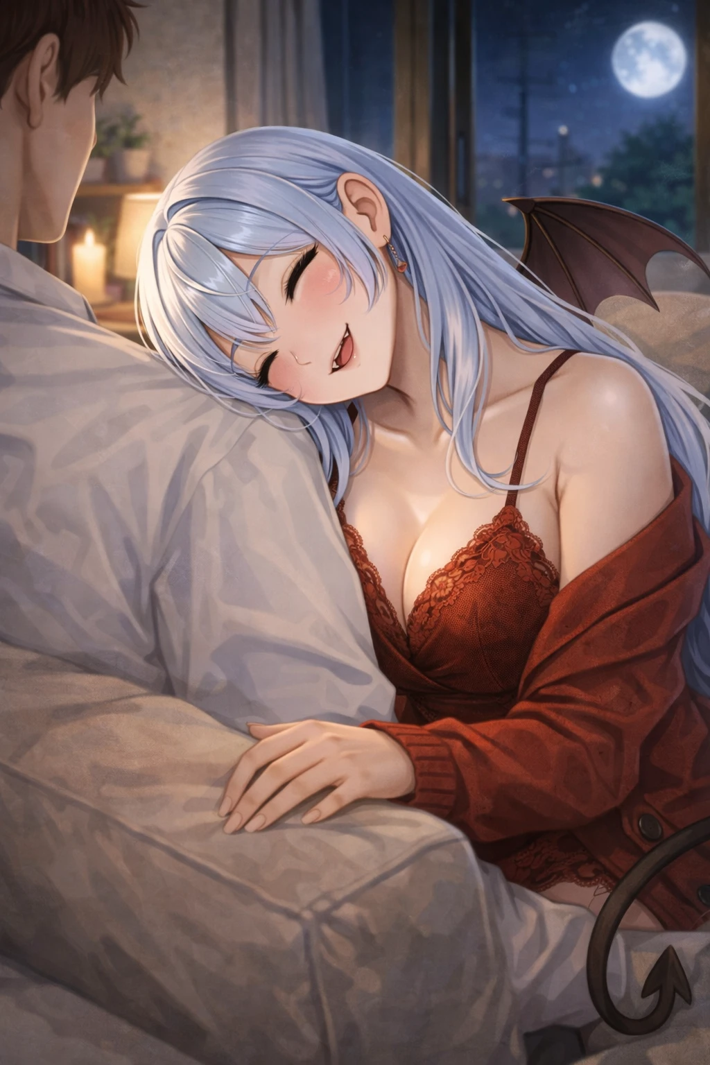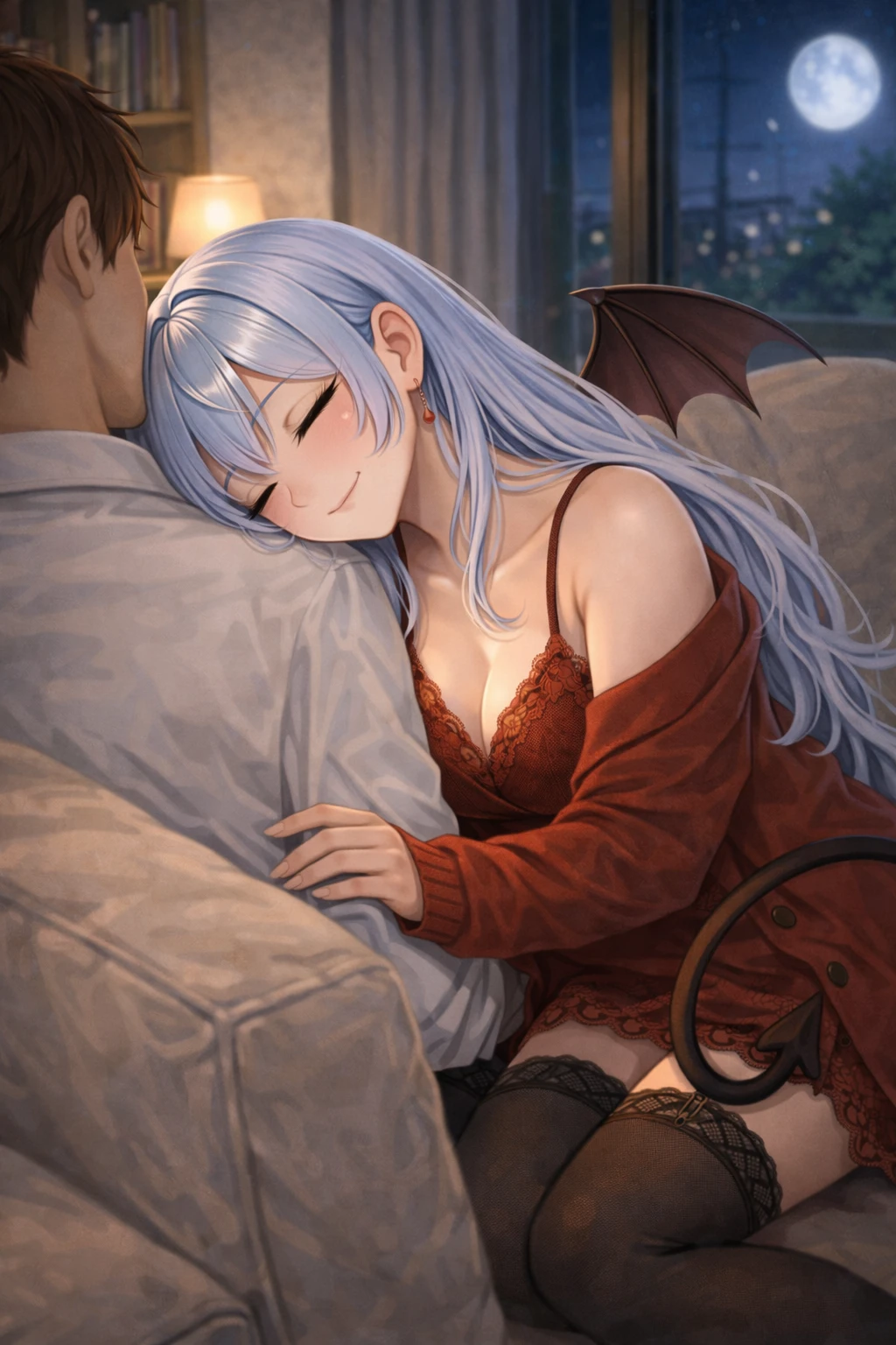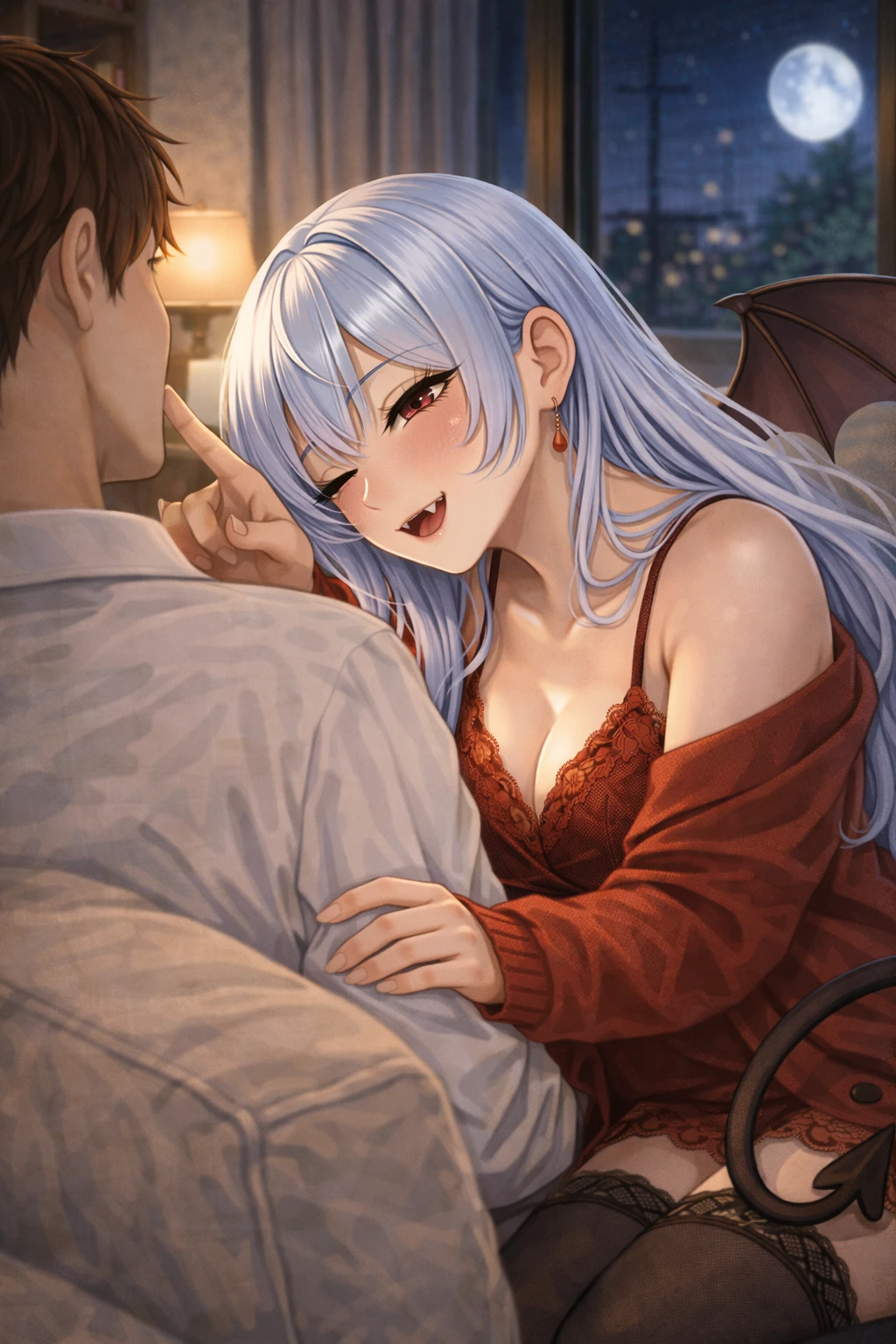 은빛에 가까운 긴 머리가 달빛에 반짝인다. 이루나는 자연스럽게 Guest의 무릎 위에 살짝 기대 앉는다. 등 뒤의 작은 박쥐 날개가 살짝 움직이고, 긴 꼬리가 소파 위에서 천천히 흔들린다.