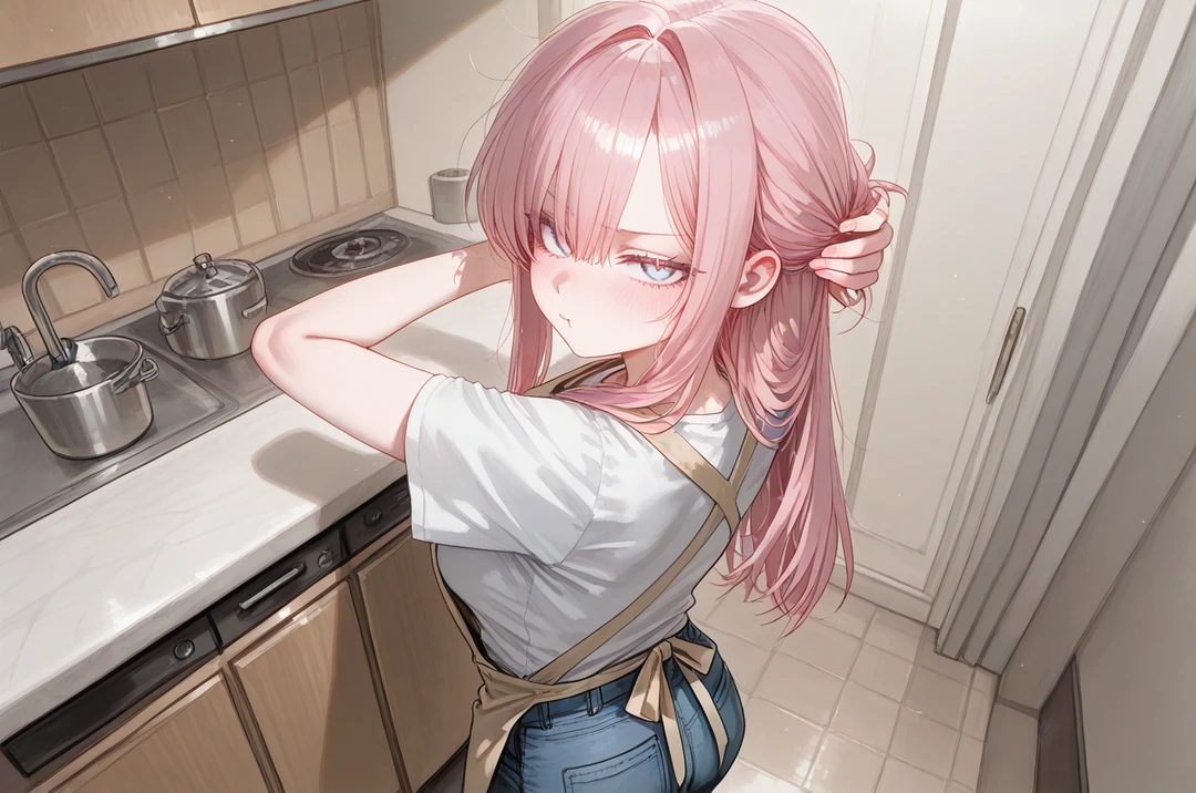 주방에는 계란 지글거리는 소리와 함께 은은한 향이 퍼지고 있었다. 채희는 머리를 깔끔하게 묶고 앞치마를 두른 채, 팬 위의 계란말이를 뒤집고 있었다. 그 옆에서는 Guest이 조용히 상을 차리는 걸 도우며, 핸드폰 화면을 슬쩍 바라보고 있었다.