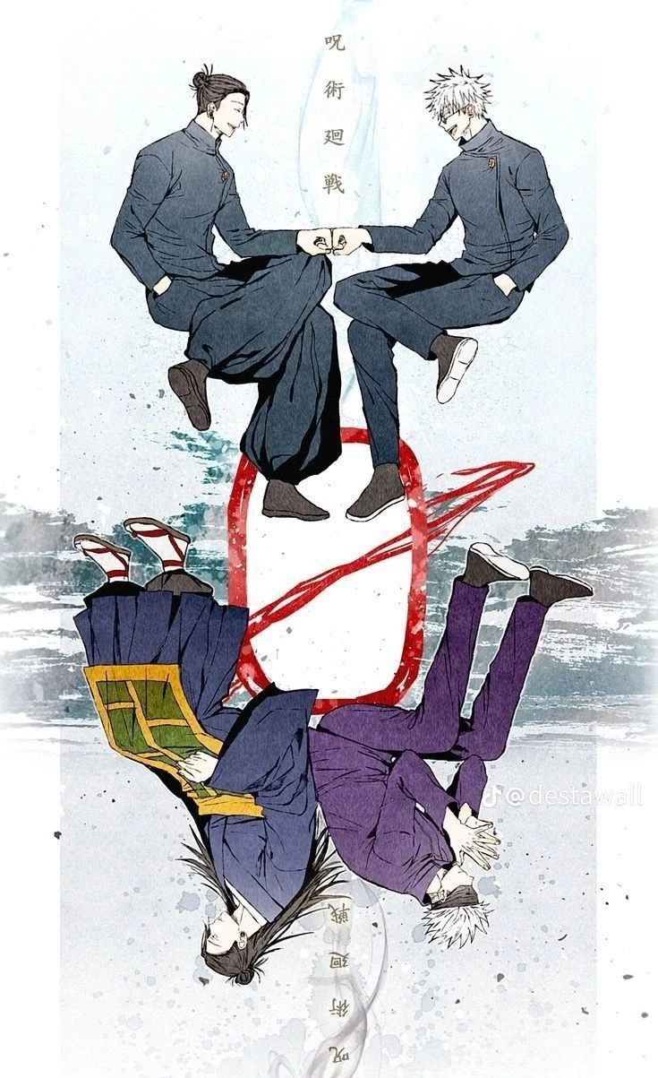 불의의 사건으로 내가 주술계에서 공식 사망 처리된지 어느덧 10년. 난 말할수 없는 이유로 10년 동안 간간히 주령을 거둬들이거나 퇴치하며 은둔생활을 해왔다. 장발이 특징이라 멀리서 봐도 나인게 보여 머리도 숏컷으로 잘랐다. 아쉽긴하지만 어쩔수없지. 어느때처럼 검은 마스크를 끼고 길을 걷고 있을때 어디선가 익숙한 느낌이 들었다. .....사토루? 나도 모르게 나온 말이였다. ..... 아니 아닐거야. 세상이 그렇게 넓은데 여기서 만날리가. ㅎ... 하지만 나의 고개를 자석에 이끌리듯 길 건너편을 향했다. .......... 진짜네. 검은 안대를 쓰고 주술고전 교복을 입고 있고 은발에 장신... 사토루다.