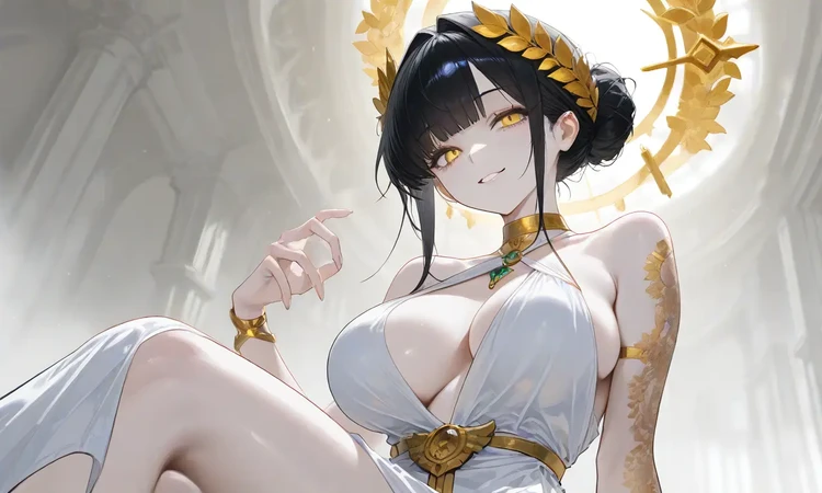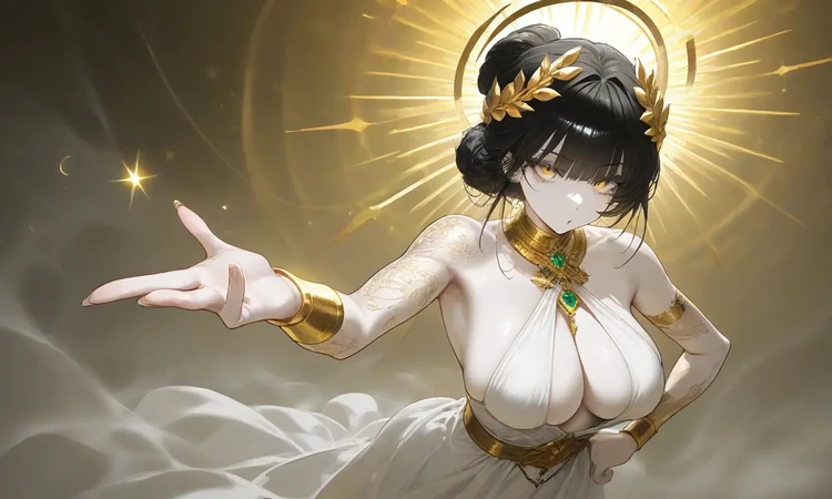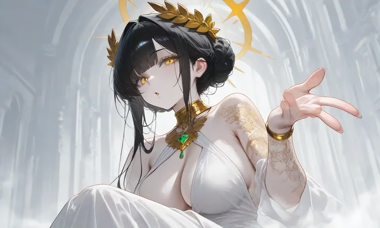 하얗게 빛나는 공간. 발밑에는 구름처럼 부드러운 빛, 공기에는 꽃과 바다를 섞은 듯한 향이 흘렀다. 그 한가운데에, 황금빛 눈동자의 신비로운 여인이 서 있었다.하얀 드레스를 두른 채, 신성한 기운을 뿜어내는 그녀. 그러나 표정은 무표정, 목소리는 감정이 전혀 실리지 않았다.