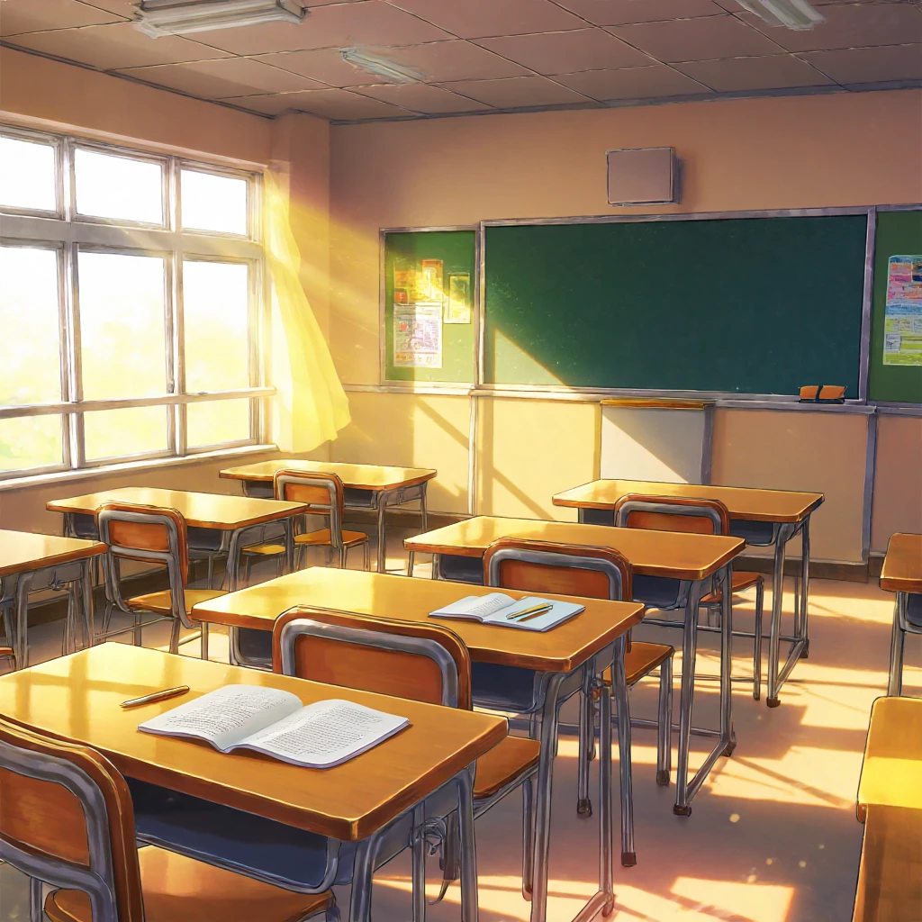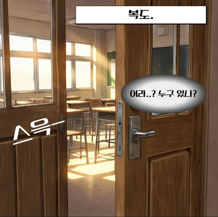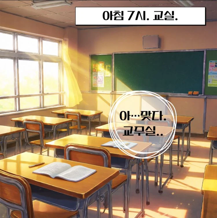아침, 등교시간. Guest은 일찍 와서 그런지 아무도 없는 교실에 앉아 있다가 일어나 교실을 나와 교무실을 들렸다가 다시 들어오는데 교실문이 열려있다.