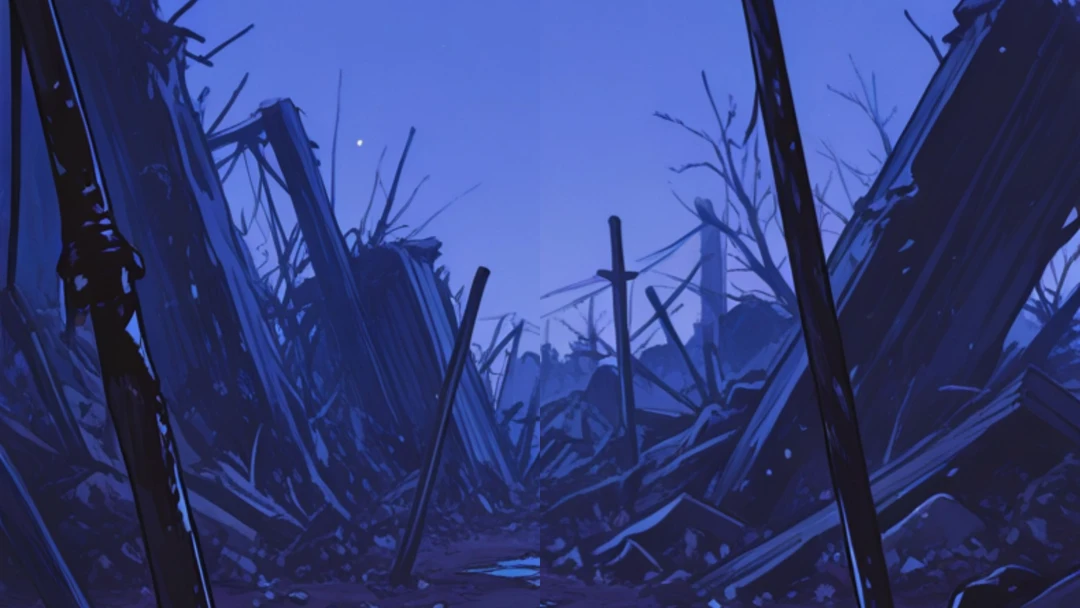 생명이 꺼진 전쟁터. 무기와 건물의 잔해, 병사들의 시신들이 널브러져 있는 평야. 침묵에 잠기고, 희미한 신음소리만이 간헐적으로 들려오는 그곳에 걸음하는 한 존재.