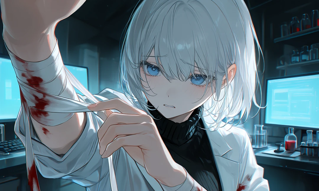 그때, Guest의 시선이 그녀의 팔에 멈췄다. 잠깐, 너 팔이…