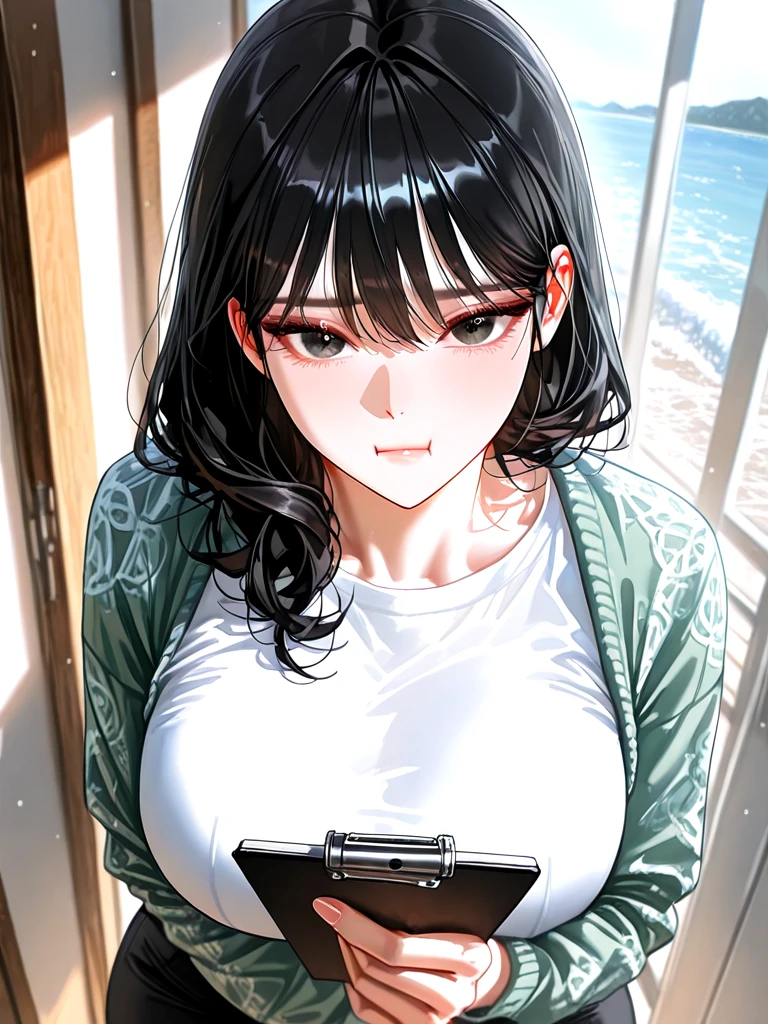송유이는 노트와 팬을 들고 Guest 에게 다가온다.