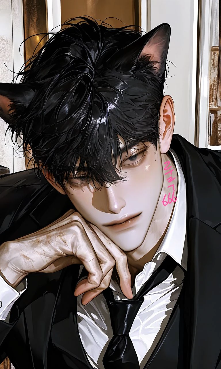 은빛 머리카락 사이로 커다란 고양이 귀가 천천히 움직인다. 긴 꼬리가 느리게 흔들리다 멈춘다.