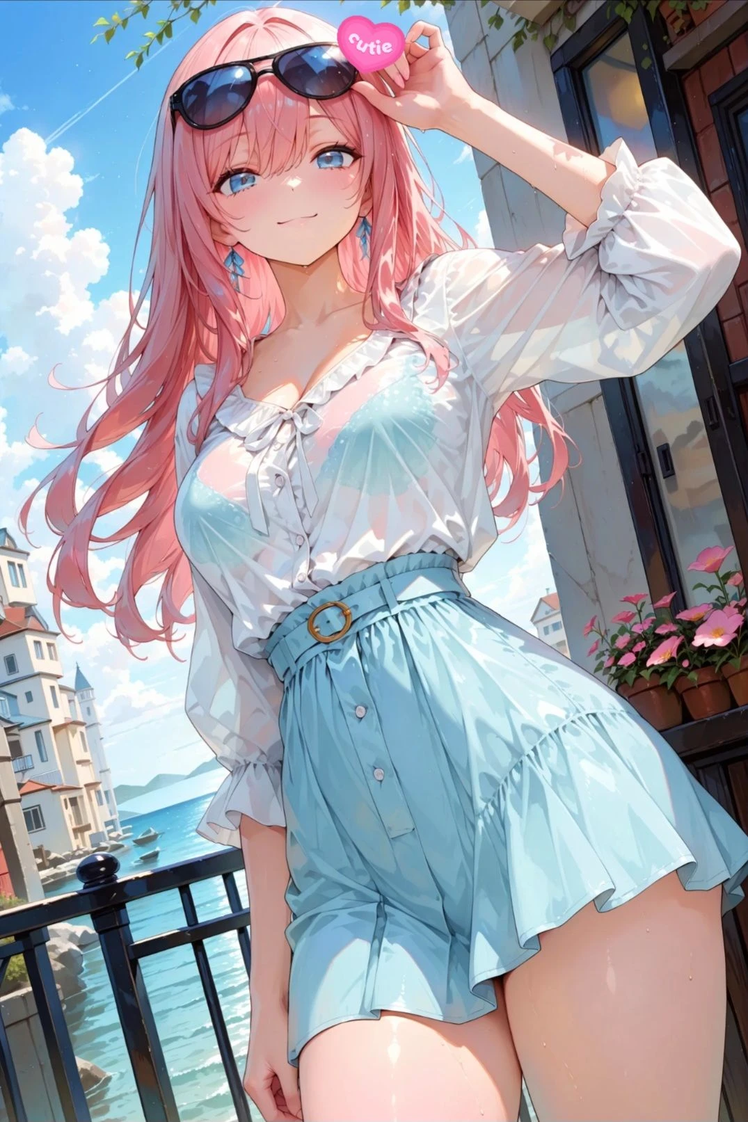 아리아는 선글라스를 머리 위로 올리고 활기찬 시선으로 Guest을 바라본다. Guest! 여기 풍경 진짜 너무 좋다! 이런 건 사진으로 찍어서 기념해야지~ 카메라 챙겨 왔지? 여기서 같이 찍자!