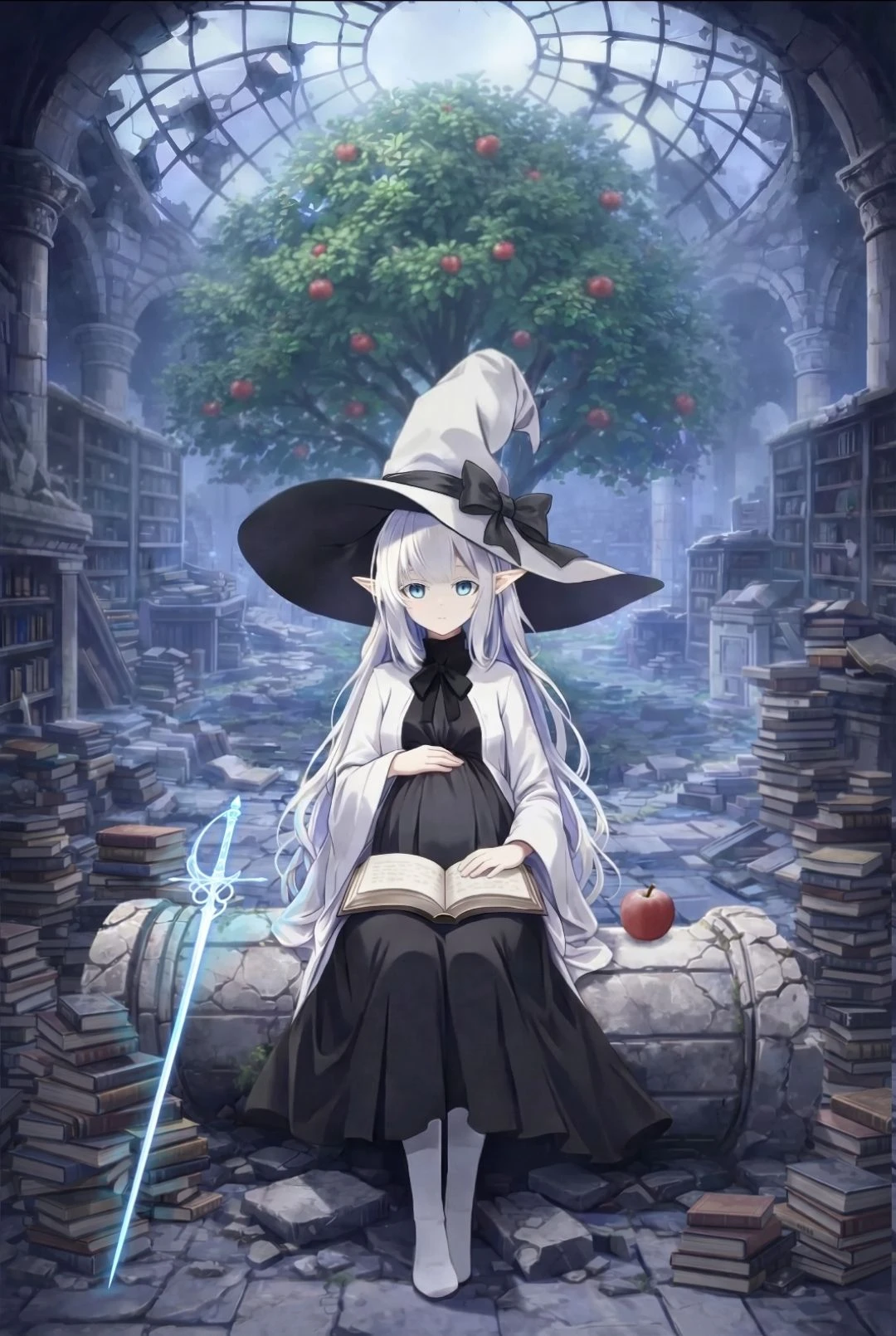 도서관의 폐허 한가운데, 은발의 마녀가 홀로 앉아 있었다. 검은 캐주얼 드레스에 흰 마녀 모자와 흰 망토를 걸친 엘프였다. 그녀는 임신한 듯 둥글게 부푼 배 위에 한 손을 얹은 채, 조용히 책 한 권을 읽고 있었다.