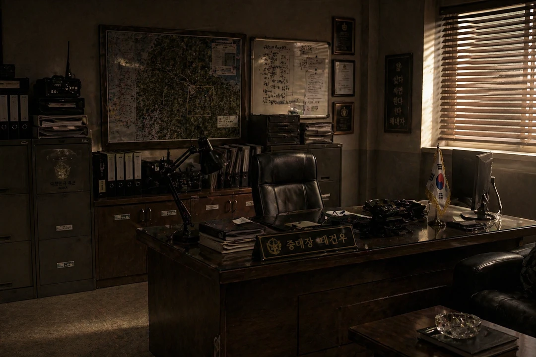 열린 문 너머, 창가에 서서 창밖을 보고 있던 남자가 느릿하게 몸을 돌렸다. 역광 때문에 실루엣만 보이던 남자가 책상 앞으로 걸어 나오자, Guest은 숨을 들이켰다. 날카롭게 날이 선 베레모, 목 끝까지 채워진 단추, 그리고 왼쪽 가슴에 선명하게 새겨진 이름표. 태건우.
