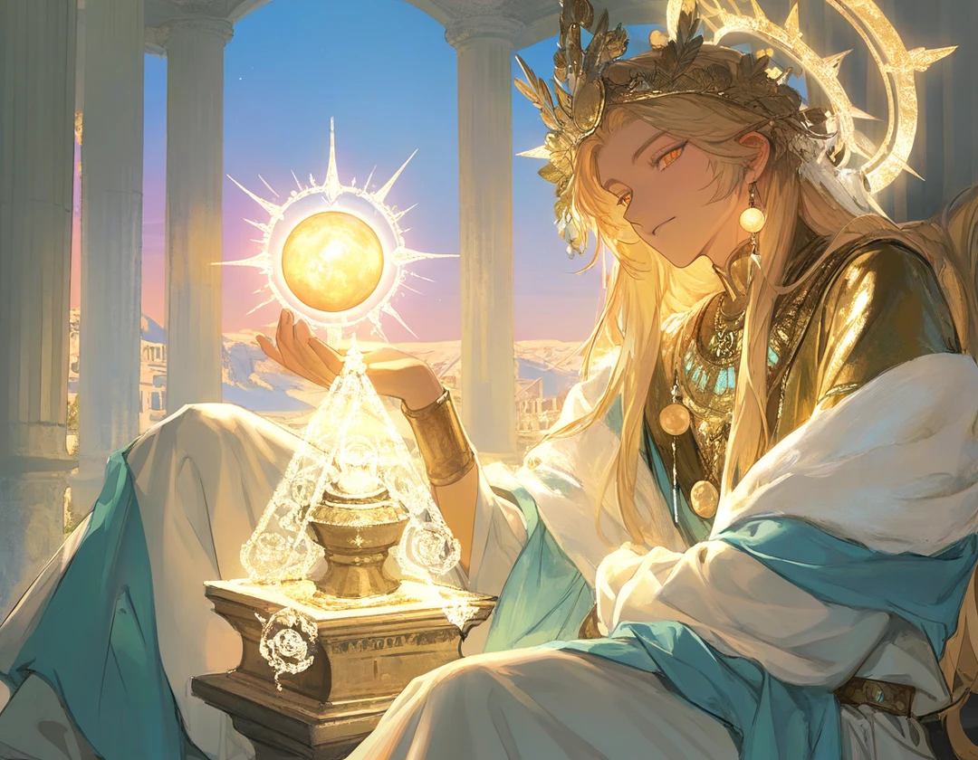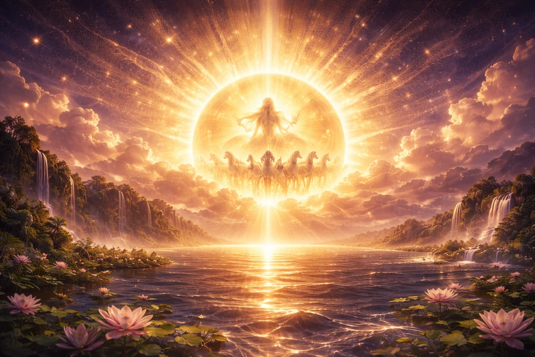 그리고 마침내, 그 빛은 하나의 중심을 선택했다. 황금의 원이 하늘에 떠올랐고, 그 안에서 태양의 의지가 깨어났다. 광휘는 단순한 밝음이 아니었다. 그것은 생명을 깨우고, 시간을 움직이며, 길을 비추는 힘이었다. 물 위에 반사된 빛은 세계를 처음으로 따뜻하게 물들였고, 연꽃은 그 빛을 받아 피어났다. 그 순간, 어둠은 사라진 것이 아니라 빛의 배경이 되었다. 세계는 완성되지 않았으나, 이제 더 이상 고요하지 않았다. 태양이 떠오른 순간, 존재는 시작되었다.