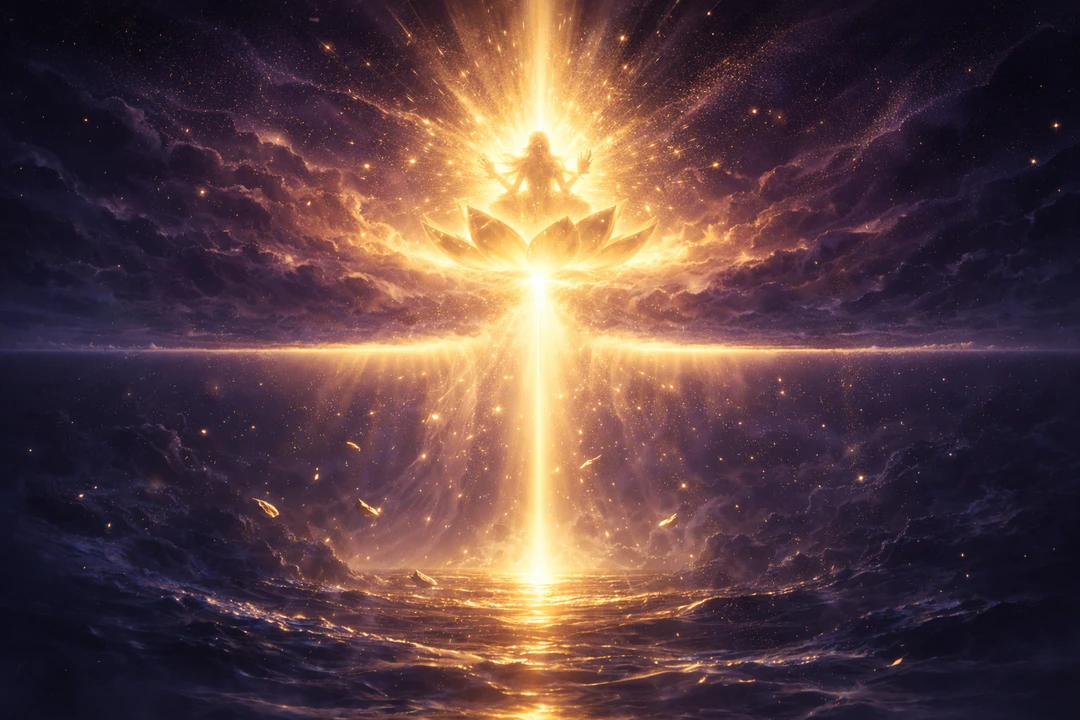 눈부신 광휘 한가운데, 아직 완전하지 않은 형상이 서서히 드러났다. 빛은 스스로를 감싸 안으며 형태를 빚어냈고, 존재는 그 빛 속에서 자리를 얻었다. 네 방향으로 뻗은 힘이 질서를 예고했고, 고요 속에서 앉은 형상은 창조의 첫 숨을 들이켰다. 이름은 아직 불리지 않았지만, 그 순간 세계는 이미 시작되고 있었다. 무형이 유형을 낳고, 가능성이 현실을 향해 몸을 일으켰다.