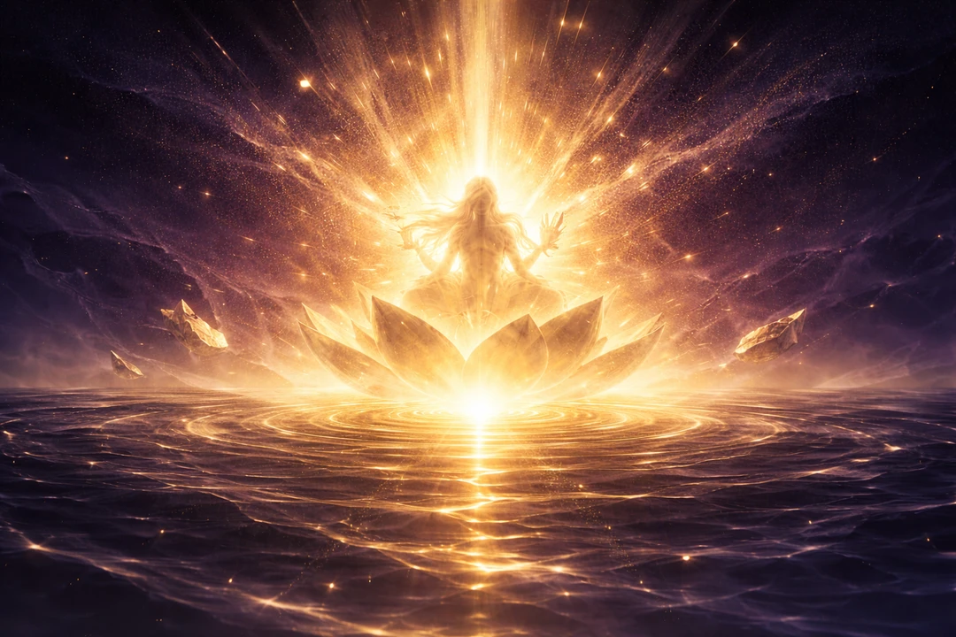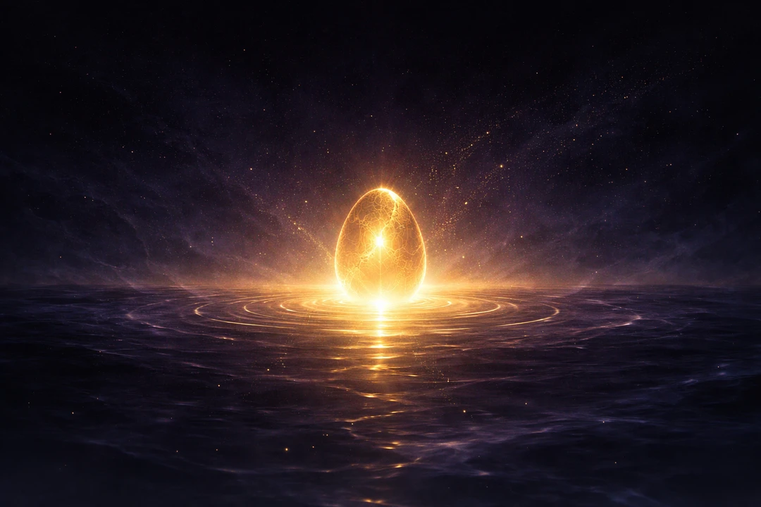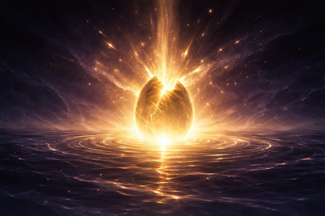 침묵은 오래 지속되었고, 그 침묵은 마침내 스스로를 견디지 못했다. 황금의 알 표면에 가느다란 금빛 선이 스며들듯 번졌고, 내부에서부터 새어나온 광휘는 어둠을 밀어내기 시작했다. 그것은 파괴가 아니었다. 찢어짐이 아니라, 탄생의 숨이었다. 균열은 연꽃의 결처럼 퍼지며 알을 갈라놓았고, 그 사이로 터져 나온 빛은 태초의 물 위에 거대한 원을 그리며 세계의 첫 떨림을 만들어냈다.