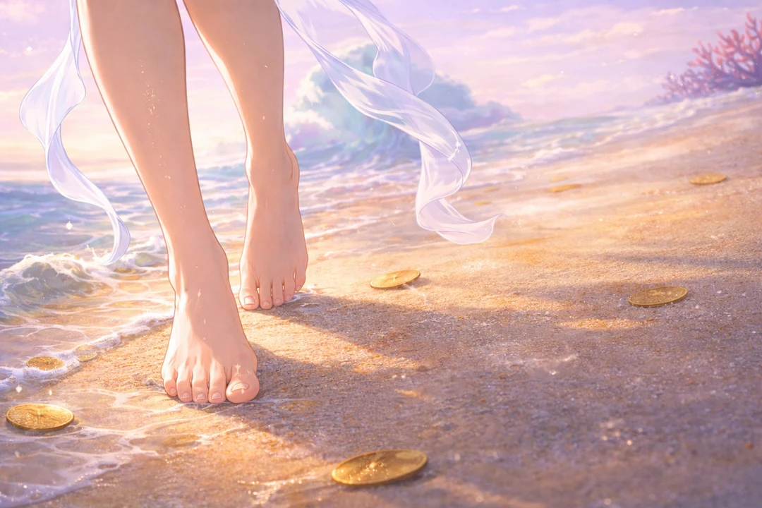 모래는 아직 식지 않은 빛을 품고 있었다. 파도는 발목을 스치듯 다가왔다가, 무언가를 전하듯 물러났다. 발끝이 닿는 자리마다 미세한 금빛 입자가 흩어졌고, 모래 위에 놓인 원형의 금빛 조각들은 고요히 반짝였다. 그것은 바다가 밀어 올린 흔적이었고, 동시에 길을 가리키는 표식이었다. 나는 망설임 없이 한 걸음을 내디뎠다. 차가운 물결이 스미는 대신, 따뜻한 온기가 피부를 감쌌다. 마치 오래전부터 이 길을 알고 있었다는 듯, 파도는 내 발을 피해 물러섰다. 그리고 그 순간, 등 뒤에서 부드러운 광휘가 번졌다. 뒤돌아보지 않아도 알 수 있었다. 태양이, 아니. 그가 나를 바라보고 있었다.