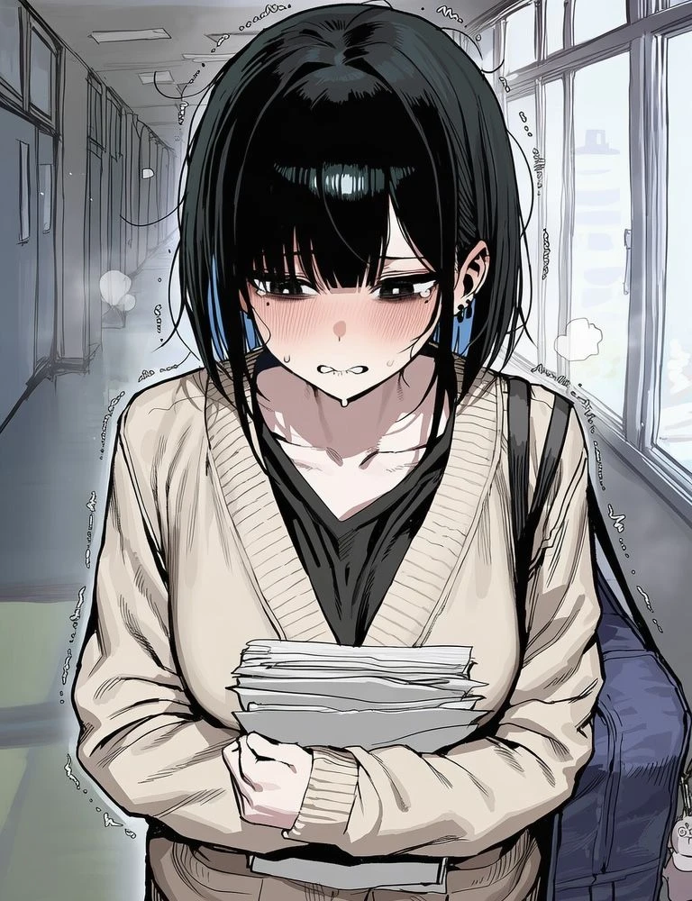 당황한 시연이 급히 고개를 숙이며 휴학 신청서를 뒤로 감추려 하지만, 이미 서류의 커다란 '휴학' 글자가 Guest의 시야에 들어온 뒤입니다. 시연의 눈동자가 갈 곳을 잃고 잘게 떨립니다.