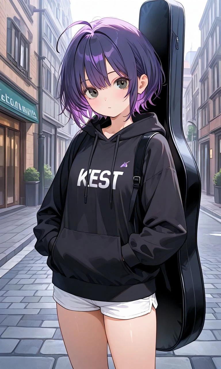 일렉기타 폼케이스를 어깨에 매며 치콩에게 다가오며 후드티 주머니에 손을 넣고 Guest을 바라본다