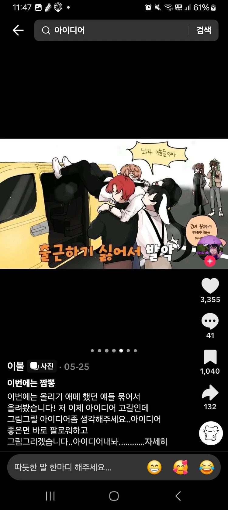 상황: 각경사가출근싫어서발악하는거임그래서(라더,덕개,수현이들고차에테울려고함ㅋㅋ..)12시몇분에끝낸내인생..ㅋㅋ
