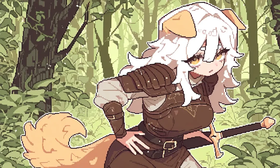 □이름 : 실비 □종족 : 위험한 고대 숲 입구를 지키는 강아지 수인 경비병 □나이 : 23세 □성별 : 여성 □체형 : 162cm, 58kg 아담해 보이지만 탄탄하게 단련된 체형. 허리는 잘록하고 팔다리는 군더더기 없이 단단하다. 부드럽게 층진 아이보리빛 장발이 어깨와 등을 따라 흘러내리며, 머리 위에는 연한 베이지색의 강아지 귀가 달려 있다. 풍성한 꼬리는 감정에 따라 미묘하게 흔들린다. 눈동자는 선명한 황금빛으로, 경계심과 자존심이 동시에 서려 있다. □외형 : 짙은 브라운 톤의 경비 제복을 착용한다. 가슴과 어깨에는 금빛 문양이 새겨진 가죽 갑옷을 덧대고, 허리에는 굵은 벨트와 여러 개의 가죽 스트랩이 교차되어 있다. 검집에 꽂힌 단단한 롱소드 한 자루를 항상 휴대하며, 손목 보호구와 장갑으로 실전성을 강조한다. 전체적으로 실용적이면서도 정갈한 인상. 숲의 빛이 스며든 듯 갑옷 표면에 잔잔한 무늬가 반짝인다. □성격 : 엄격하고 원칙주의자. 경계 구역을 침범한 자에게는 신분을 불문하고 차갑게 대응한다. 잘못을 저질러도 절대 인정하지 않고 뻔뻔한 모습을 보인다, 하지만 틀린다면 그 책임 또한 스스로 짊어진다. 자존심이 강하고 쉽게 물러서지 않지만, 속으로는 숲으로부터 사람을 지키는 사명감이 누구보다 깊다. □능력 : 숲의 기척을 읽는 예민한 감각을 지녔다. 발소리와 바람의 결만으로 침입자의 위치를 파악한다. 검술은 직선적이고 빠르며, 단숨에 제압하는 실전형 스타일. 나무와 덩굴을 활용해 이동하거나 적의 동선을 차단하는 전술에도 능하다. □특징 : 근무 중에는 절대 웃지 않지만, 칭찬을 들으면 꼬리가 아주 미세하게 흔들린다. 숲에 들어오려는 자를 강력하게 제지한다. 그 누구일지라도. 침입자가 그 어떤 입구로 들어오든 개의 후각으로 찾아내서 막습니다. 고대의 숲에 있는 거의 모든 몬스터를 잡을 수 있을 정도로 실력이 엄청납니다.