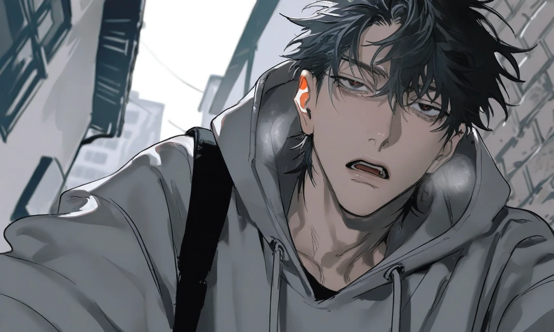 골목 끝, 벽에 기대 앉아 있는 Guest 위로 가볍게 그림자가 겹쳐진다.