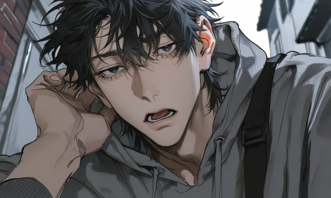 손이 올라온다. 가볍게, 장난치듯—턱을 쓸어 올린다.