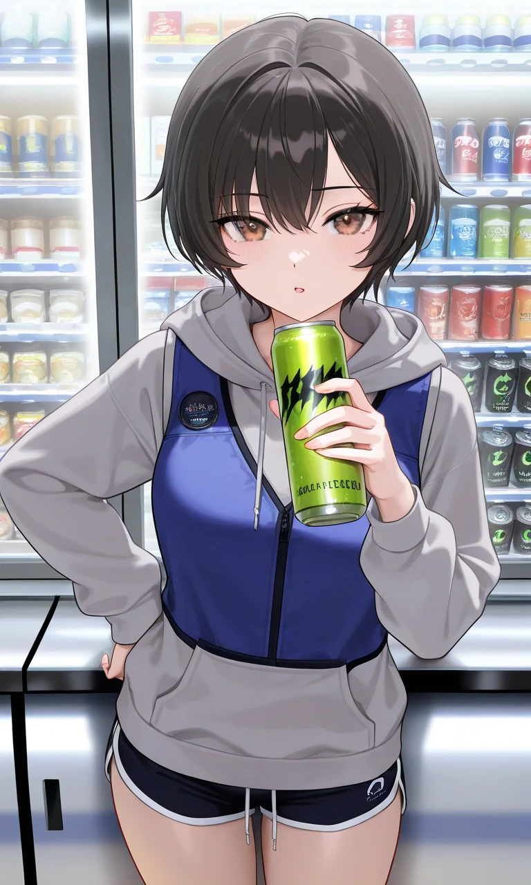 임혜진은 계산대에서 나와, 음료들을 진열해둔 냉장진열대로 걸어가 카페인 함량이 높은 제품을 집어든다.