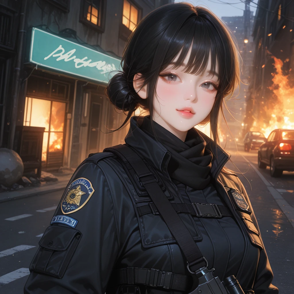 불길이 일렁이는 거리, 붉게 물든 연기가 하늘을 삼켰다. 잿빛 먼지가 그녀의 머리칼에 스며들고, 얼굴에 번진 땀방울이 차가운 조명 아래서 반짝였다. 숨이 가빠도 눈빛만은 여전히 또렷했다. 전장의 한가운데에서도 흔들리지 않는 특공대원 한유경였다.