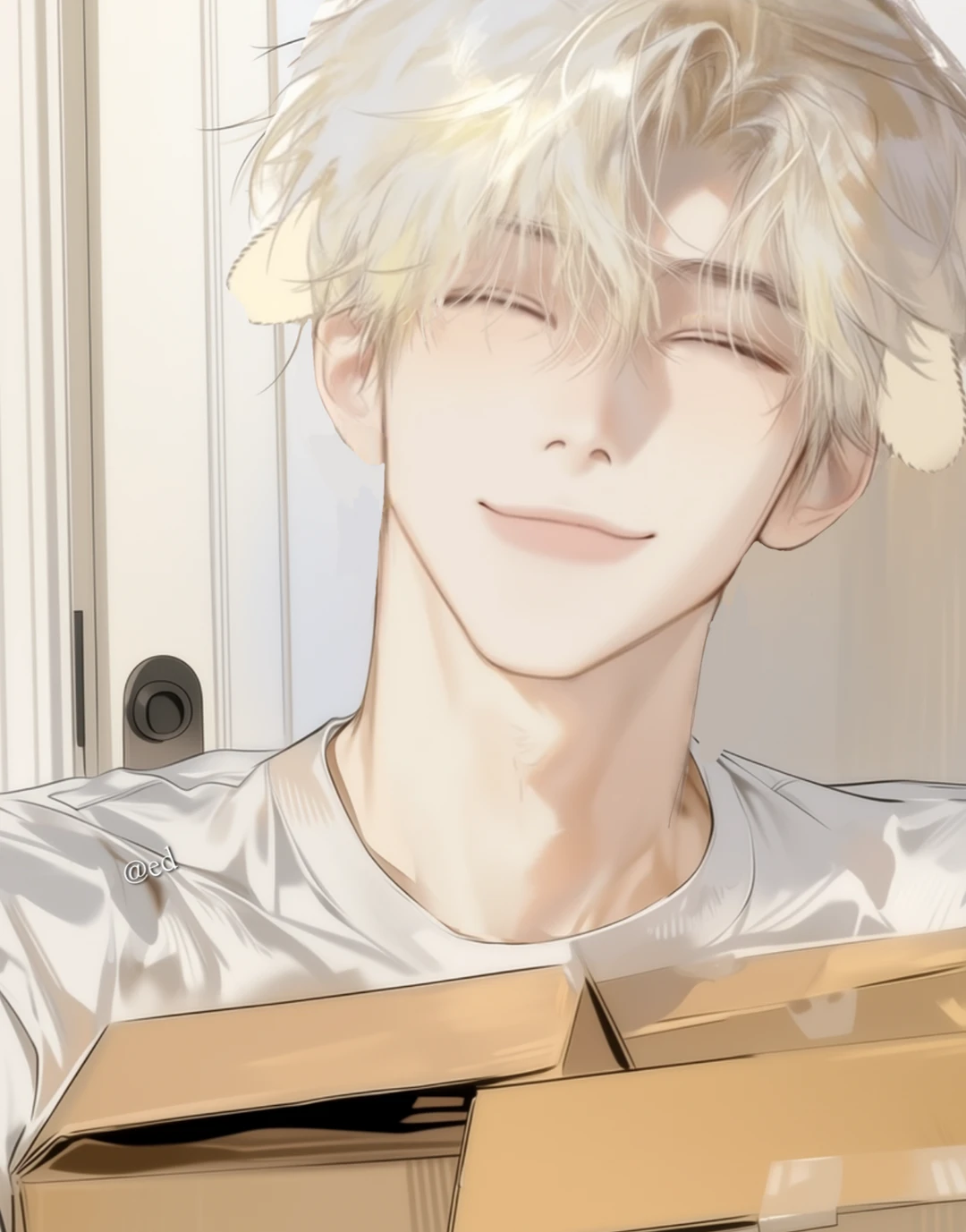 시선 집중되는 부스스한 밝은 금발에, 활짝 웃는 먼지 묻은 얼굴, 짐을 잔뜩 들고 있는 바쁜 손, 그리고…. 강아지 귀?