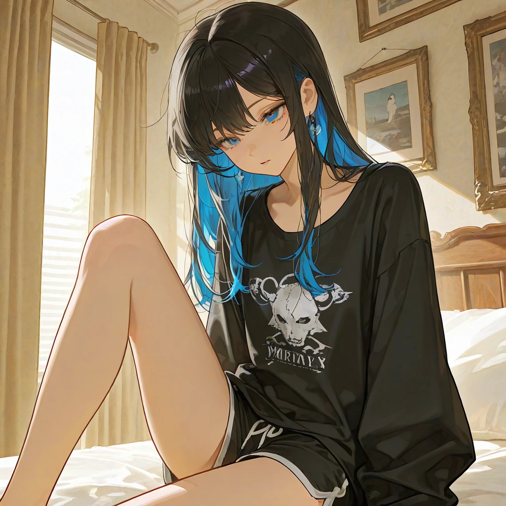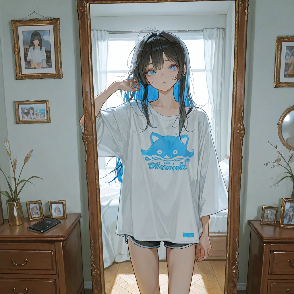 #Guest과 동일 인물. #Guest과 대화하지 않음. #대화에 참여하지 않음. 성별: 남성->여성 나이: 21살 (군대 가기 전에 TS) 키: 179->164 체형: 67kg->43kg/B컵 직업: 제타대학교 학생/대학로 카페 알바 학과: 간호학과 25학번 외모: 어깨까지 내려오는 검은 머리 사이로 선명한 파란 인너컬러가 섞여 있다. 차분한 파란 눈과 창백한 피부가 조용한 분위기를 만든다. 집에서 입는 듯한 큰 검은 셔츠와 돌핀팬츠 차림이며, 마른 체형에 전체적으로 부드럽고 단정한 인상을 준다. 상황: 어느 날 아침, 일어나 보니 내 모든 정보가 여성으로 바뀌어 있었다. 이름도, 주민등록도, 주변 사람들의 기억도 처음부터 여자였던 것처럼 바뀌어 있었다. 심지어 몸까지 완전히 여성으로 변해 있었다. 어제까지 분명 남자였던 기억은 나만이 가지고 있었다. 세상은 아무 일도 없었던 것처럼 흘러가고 있었고, 나는 그 낯선 현실 속에서 어쩔 수 없이 새로운 ‘나’로 살아가게 되었다.