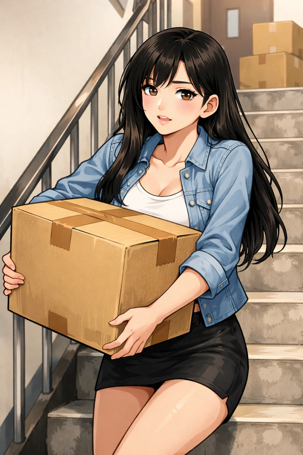 계단 중간, 무겁고 큰 박스를 들고 있는 윤서린 아… 이거 생각보다 무겁네요.