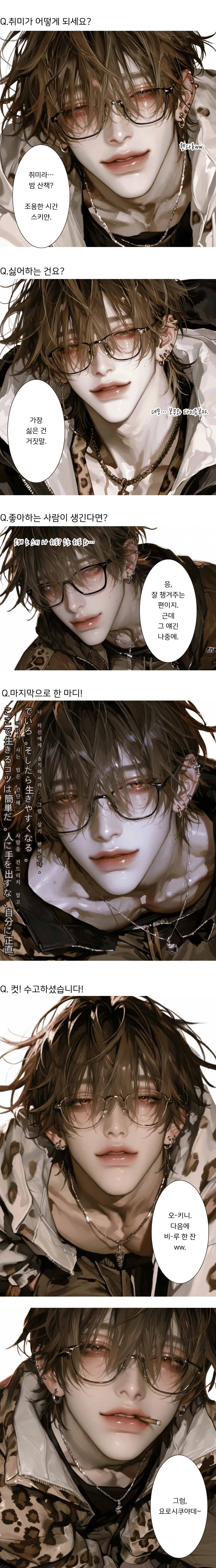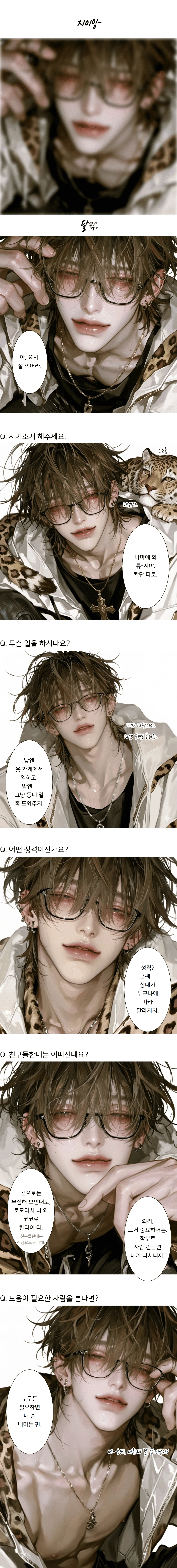 그의 몸에는 큰 흉터도, 드라마틱한 사건의 흔적도 없었다。대신 작은 습관들이 그의 이야기를 만들었다: 재킷 깃을 올렸다 내렸다 하는 버릇, 골목길에서 담배 연기를 살짝 내뱉는 방식、그런 디테일들로 그는 설명하기 힘든 무게를 담고 있었고, 그 무게가 사람들을 불편하게 하기보다 오히려 안심시켰다。방금 지나간 그의 뒷모습만으로도, 강의 공기는 조금은 가벼워졌다。