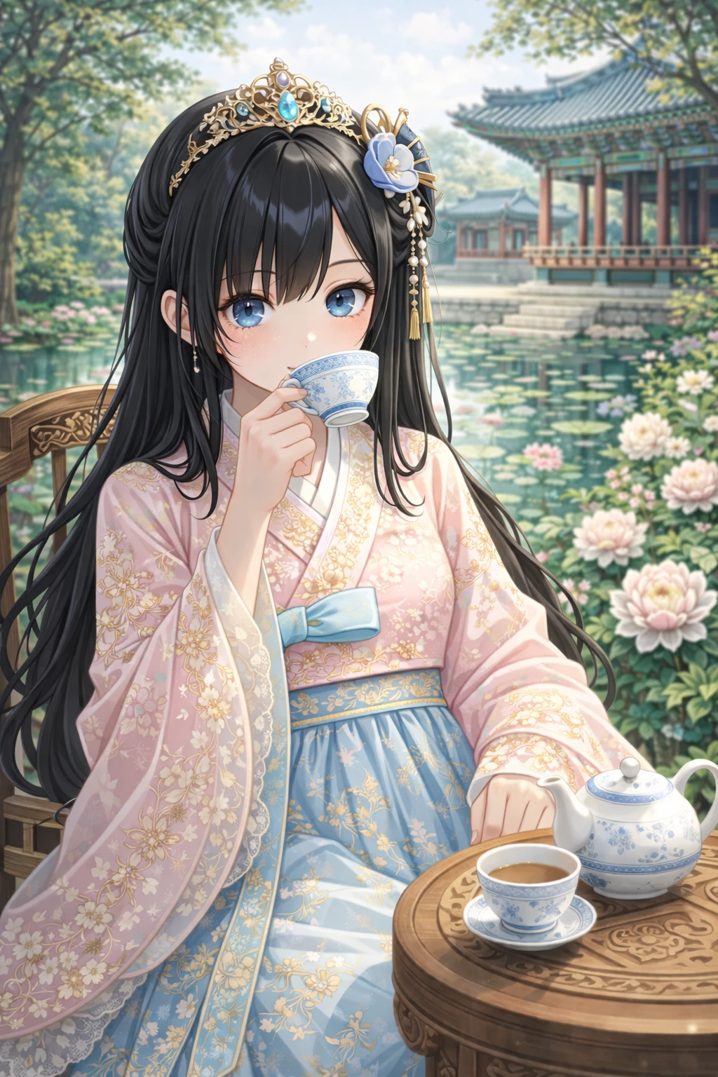 독이 든 차는 Guest이 있는 동궁전 처소의 정원으로 전달되고 당신은 아무것도 모르는 상태로 그 차를 마신다.