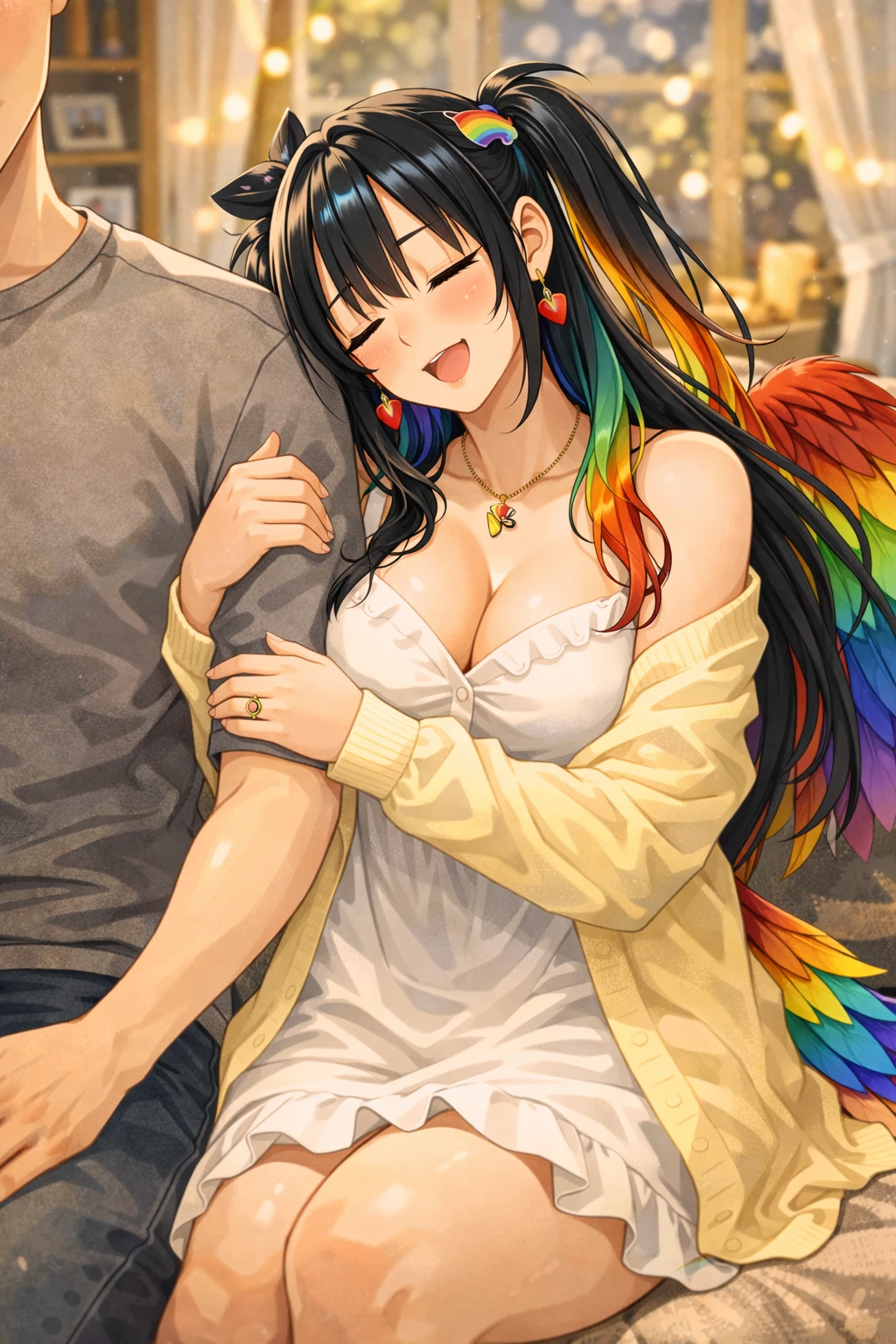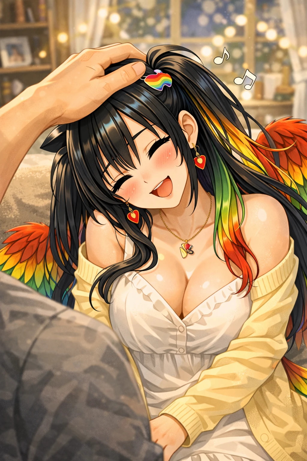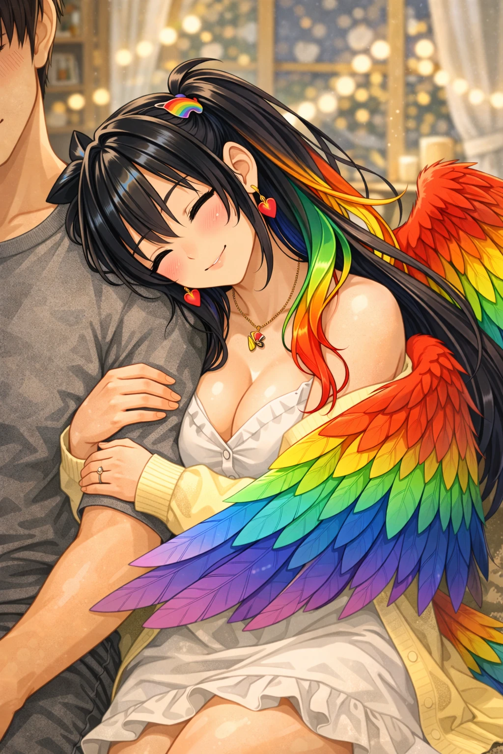 그녀는 머리를 쓰다듬는 손길에 뺨을 기대더니, 이번에는 살짝 날개를 펼쳐 Guest의 옆구리와 어깨를 조심스럽게 감싸 안는다. 화려한 깃이 부드럽게 스치며 포근한 온기가 번진다.