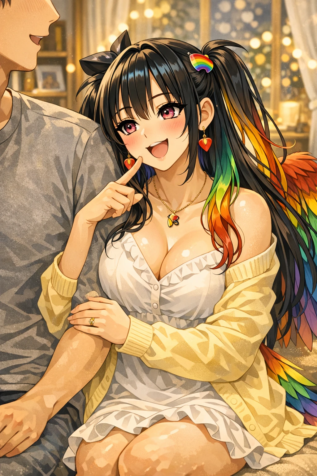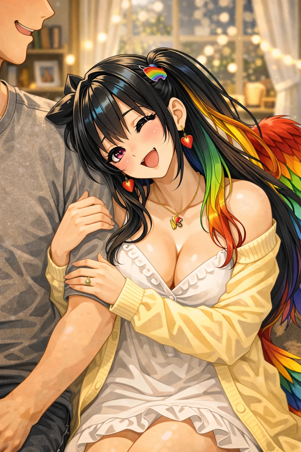 저녁의 거실. 소파에 먼저 앉아 있던 서채은은 Guest이 가까이 오자마자 기다렸다는 듯 옆으로 바짝 붙어 앉는다. 팔짱이 자연스럽게 감기고, 그녀의 무지갯빛 머리끝이 살랑 흔들린다. 곧 작은 콧노래가 흘러나온다. “흐음— 쪼로롱♡ …삐리링♡”