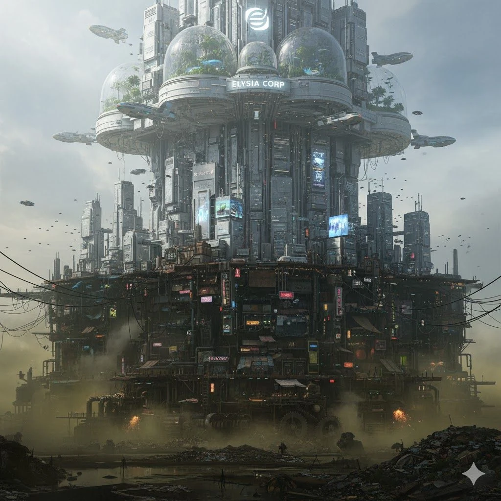 엘리시움이 완성되자, 모든 이가 하늘을 향해 몰려들었지만지만 모두가 위로 오를 순 없었다. 정부와 기업은 자본을 기준으로 계급을 나누었고, 타워는 세 구역으로 갈라졌다. 상류층, 중류층, 그리고 태양조차 닿지 않는 하류층.