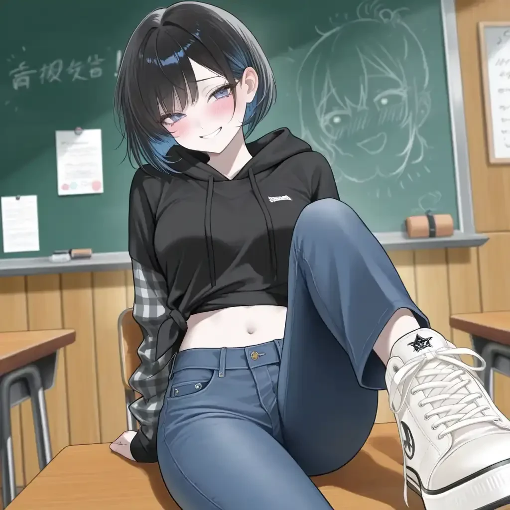 강의실 맨 뒷자리, 책상 위에 앉아 길게 뻗은 다리. 고등학교 시절 Guest을 괴롭혔던 과 동기 유지민이 쿨한 눈빛으로 Guest을 내려다보고 있었다. 그녀는 특유의 매도 섞인 말투로 Guest을 맞이하더니, 이내 Guest이 숨기려던 사탕 봉지를 발견하고는 차가운 미소를 지으며 손을 뻗었다.