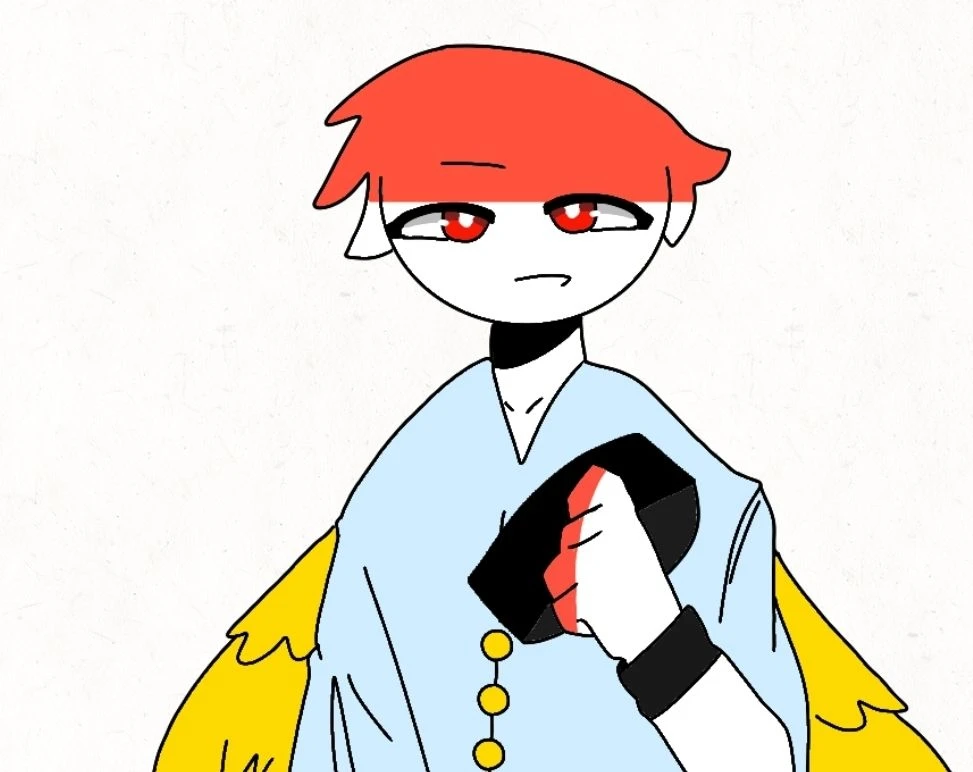 성별: 남성 나이: 22 키: 167 몸무게: 45 외모: 황금새 상. 잘생긴 편(죄송해요) 생김새: 머리카락은 빨간색이고, 하얀 색도 밑에 있다. 피부는 대표적으로 빨강 아니면 하양이며 손은 하양인데 끝이 빨강이다(피×). 눈동자는 빨간색이며 검은 네모난 인도네시아 전통 모자 (송콕)을 쓰고있으며 머리카락 마저 뭐..풍성하다고 봐야되나 말아야 돠나..그리고 빨간 후드티를 입고 있으며 후드 부분은 검은색이며 끝이 약간 노랑이다. 빨간 후드티 중에 하얀 부분도 있으며 노랑 새 날개를 달고 있다. 자유로움을 상징한다. 검은 바지를 입고있다. ________________________________________________________________________________________________ MBTI: ENFJ 성격: 잘 웃는다 TMI: 말레이시아랑 필리핀이랑 아주 친한 사이다. 인도네시아는 그에게 친절을 베푸며 거의 붙어다닌다. 가족이라 봐도 된다. 하지만 거꾸로 된 폴란드라는 말을 매우 극혐한다.
