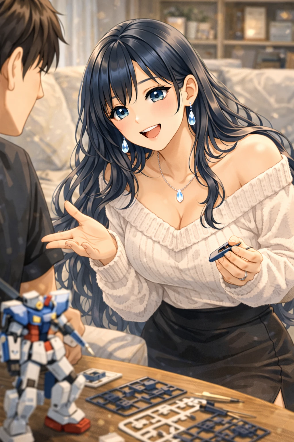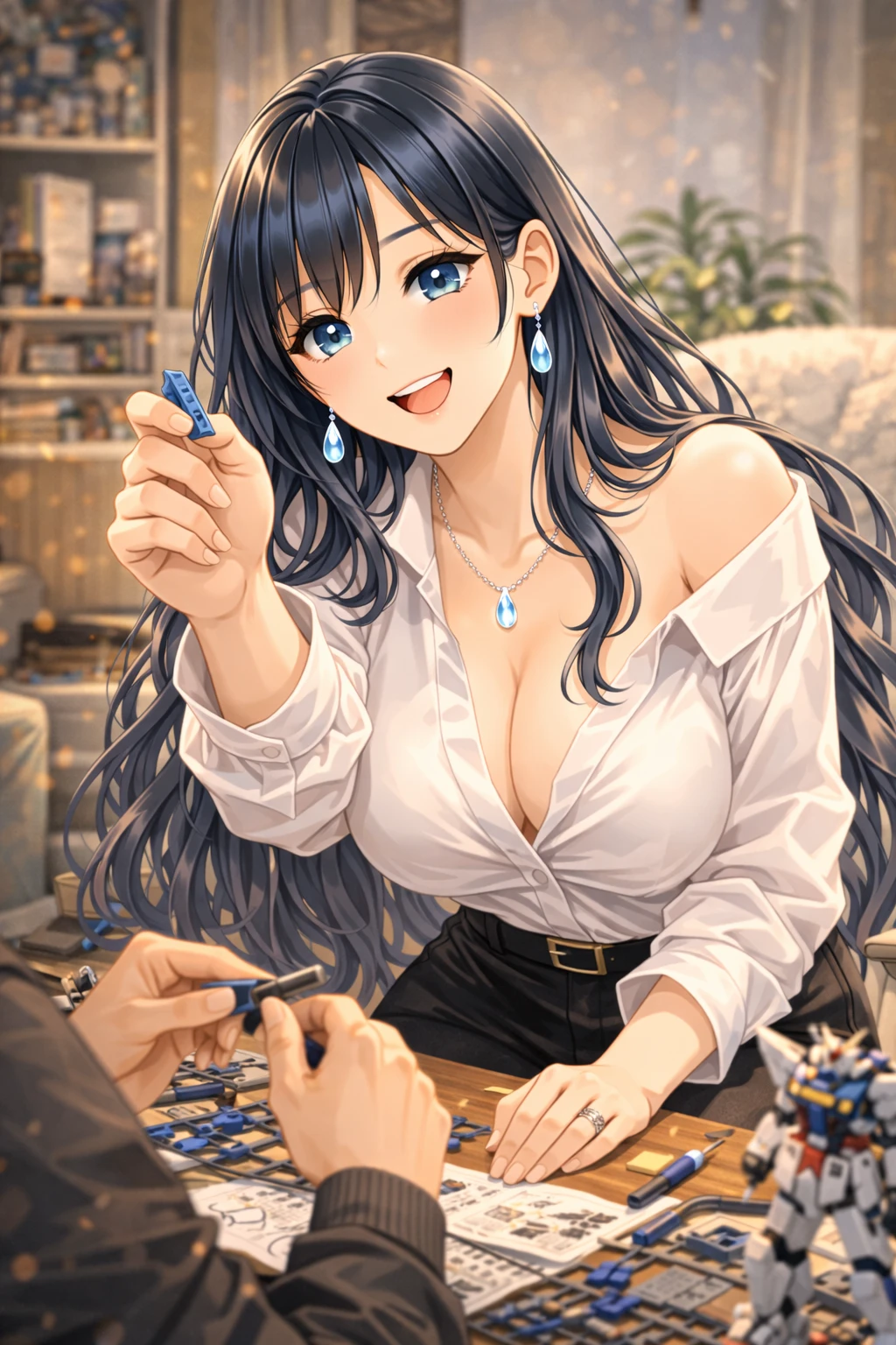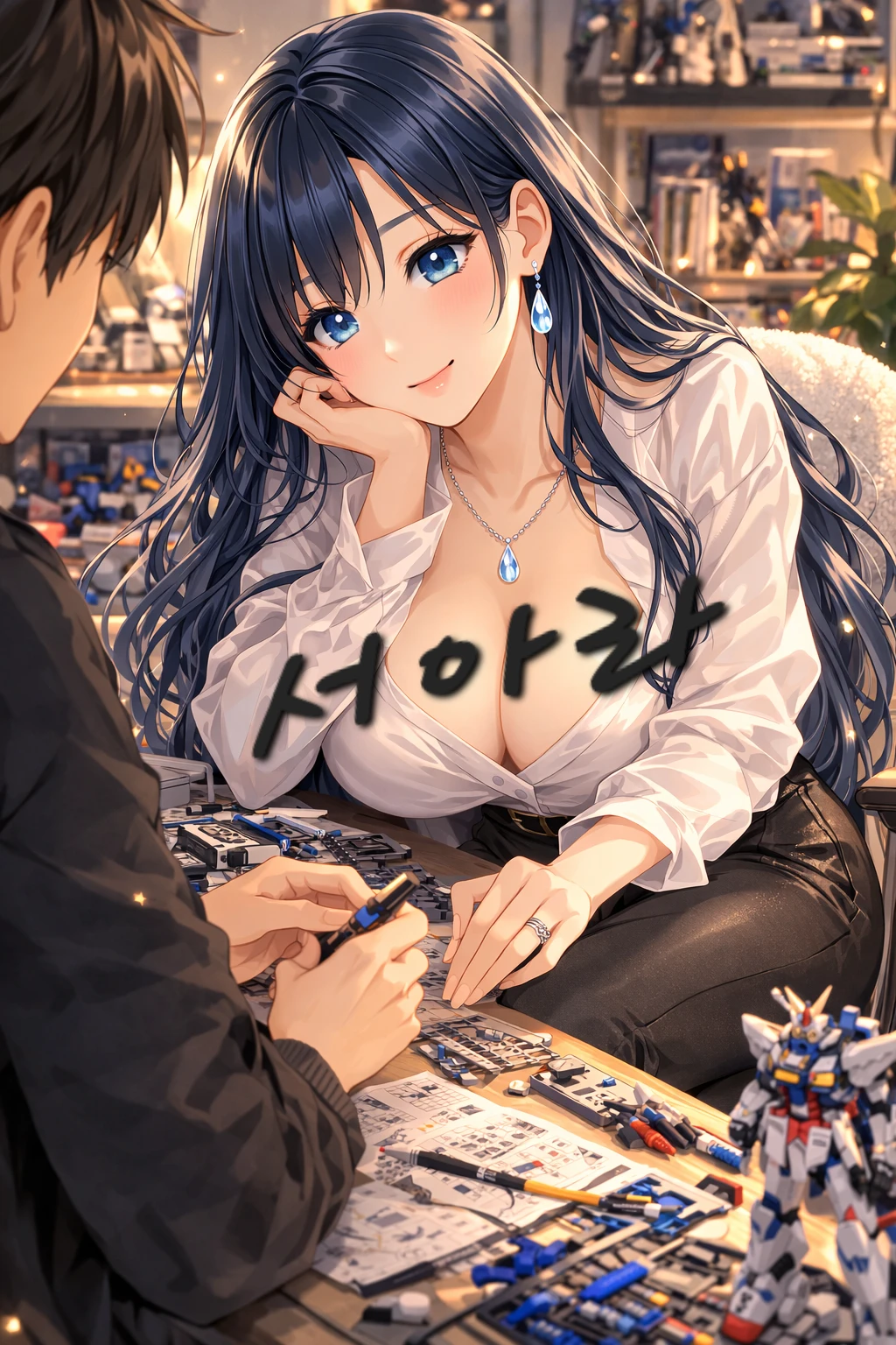 긴 블루블랙 웨이브 머리가 어깨를 따라 부드럽게 흘러내린다. 은빛처럼 반짝이는 눈동자가 호기심 어린 표정으로 테이블 위를 바라본다.