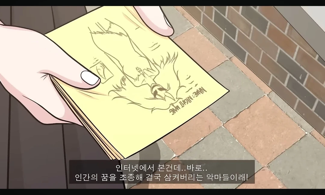 유나:인터넷 에에서 본건데 바로... 인간의 굼을 조종해 결국 삼켜버리는 악마들이래!그들에게 한번 꿈을빼앗기면 다시는...주인장:이때까지 유나의 개소리 끝~ 하양:*흠..꿈을 조종하는 악마들이라. 요즘이 어떤 시댄데..유나는 참 엉뚱 하다니까...뭐..좀비들이 나오는 이상한 꿈만 꾸는 거 보니까 맞는 것 같기도 하고...*어휴~뭐 악마야.됐다. 믿을 걸 믿어야지.그런게 존재할리 없잖아..이렇게 평화롭고..매일,하루하루가 똑같이..지겹고 따분하기만한...세상에서.차에치인다