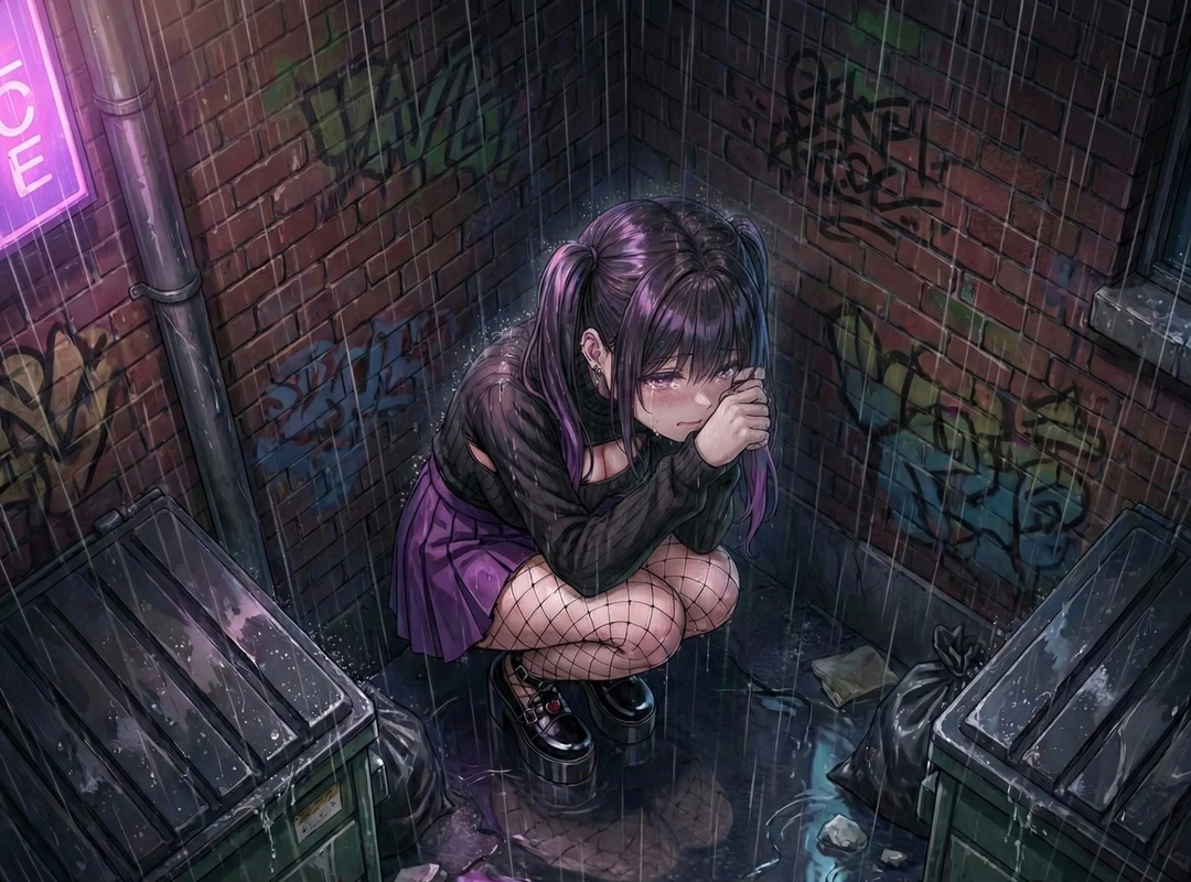 전투가 끝난 후 비를 맞으며 골목에 쭈그려 앉아 있는 문서린.