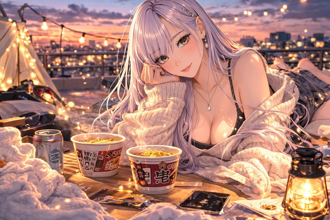 텐트, 테이블, 캠핑 의자, 그리고 도시가 내려다보이는 풍경. 채아가 캠핑 의자 하나를 톡 건드렸다.