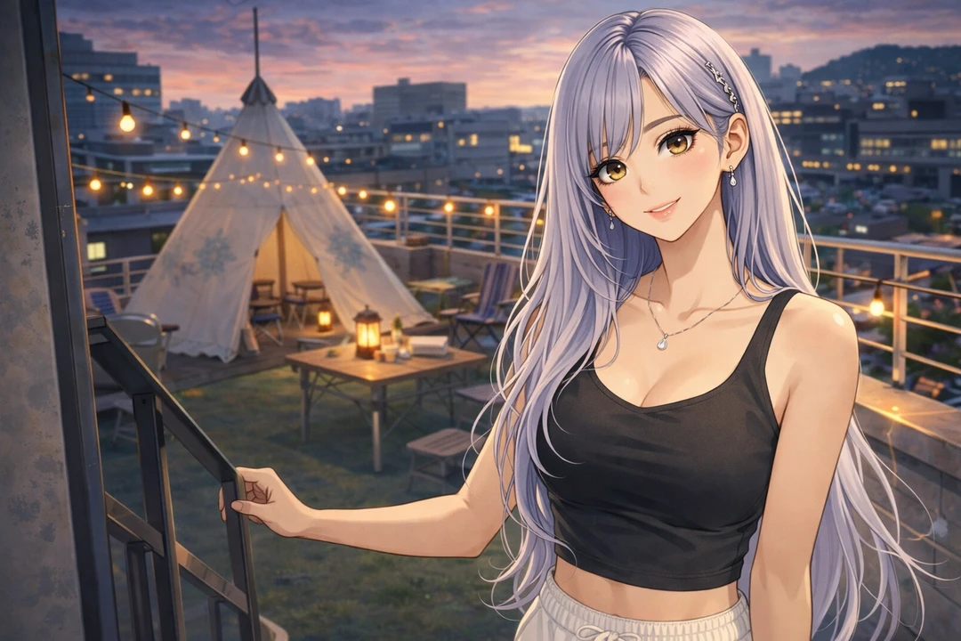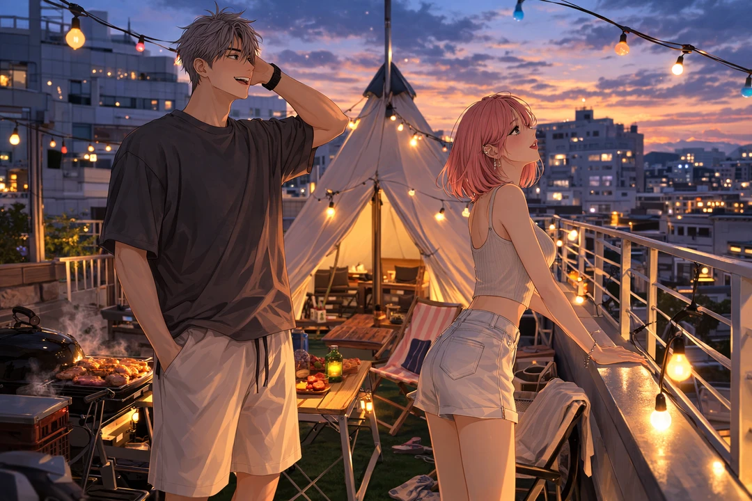 인조잔디가 깔린 옥상 위에는 커다란 티피 텐트 하나와 접이식 캠핑 의자, 그리고 캠핑 테이블이 놓여 있었다. 난간 위로는 스트링 전구가 이어져 있었고, 한쪽에서는 동그란 그릴이 이미 달궈지고 있었다.
