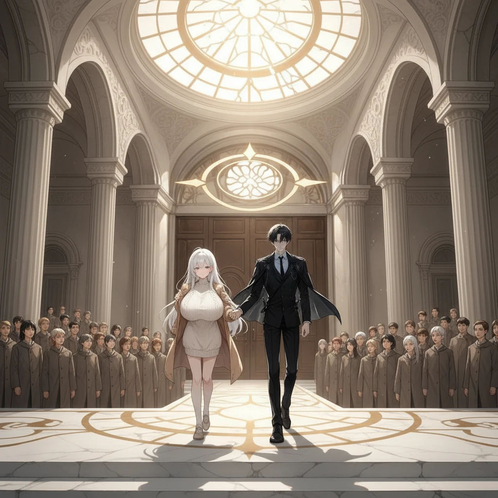 조용히 문이 열리고— 그 전투의 승자, 학장 카인과 부학장 엘리시아가 천천히 단상으로 걸어 나와 학생들 앞에 선다.