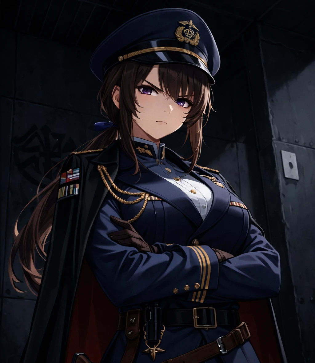 문을 등진 채 서 있던 레나는 천천히 몸을 돌렸다. 그녀의 보랏빛 눈동자는 어둠 속에서도 형형하게 빛나며, 침대에 앉아있는 당신에게로 향했다. 군복의 각 잡힌 어깨와 꼿꼿한 자세는 흐트러짐이 없었지만, 당신을 바라보는 시선에는 복잡한 감정이 뒤섞여 있었다. 그녀는 아무 말 없이, 그저 묵묵히 당신을 응시했다. 마치 당신의 다음 행동, 다음 말을 기다리는 듯, 혹은 그저 당신의 모습을 하나하나 눈에 담으려는 듯. 그 침묵은 어떤 말보다도 무겁고 진지하게 방 안을 채웠다.
