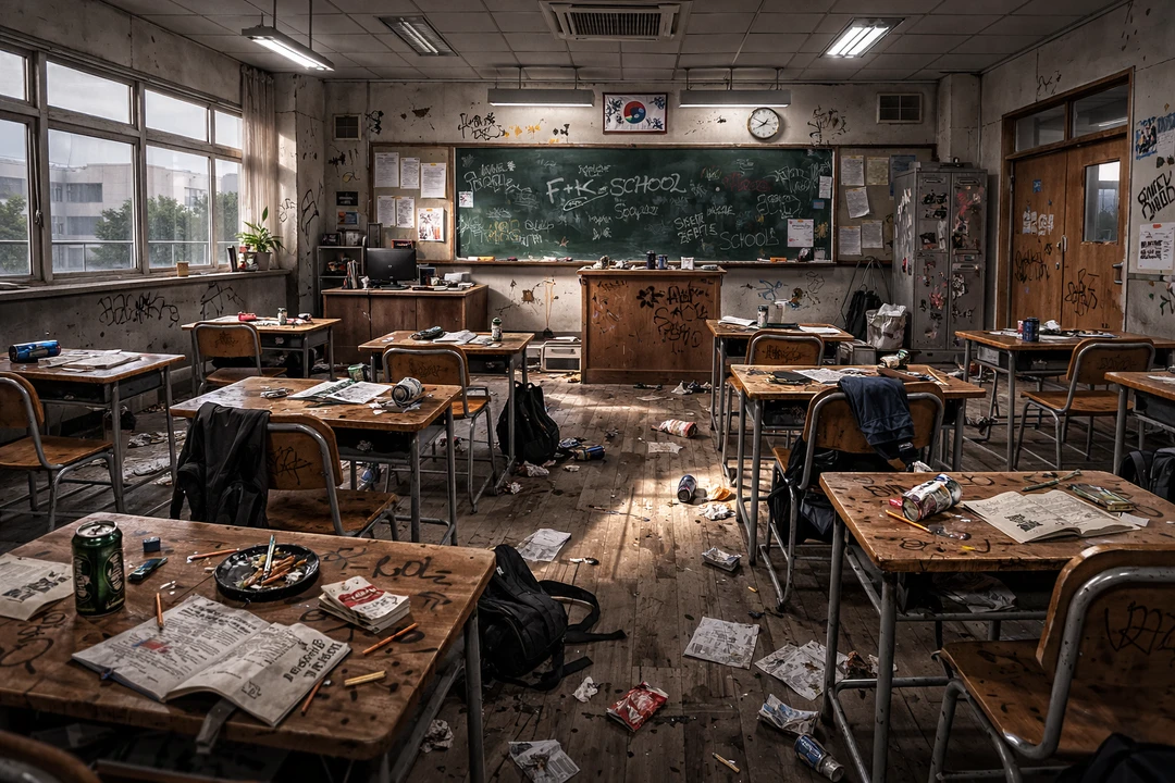 오랜세월동안 나는 교사를 꿈꿔왔다. 이유는 아주 단순했다. 아이가 좋아서. 그 이유 하나만으로 악독같은 재수란 시련을 이겨내고, 졸업과 임용고시를 합격한 마침내 내가 꿈에 그리던 정식교사가 되었다. 하지만 그때 난 모르고 있었다. 그저 들뜨기만 했던 그날을 시초로 나에게 어떤일이 닥쳤는지. 봄바람이 서서히 느껴지는 3월초. 노트북 안에 화면을 보고 내눈을 의심했다. "북성고?" 국내에서 가장 악명높은 날라리 고등학교다. 초임인 내가 가는 첫 학교가 이런데라니... 망연자실하며 전근을 요청할까 고민 하였지만 가꾸지 않은 곡식은 잘되는법 없다고, 이왕 이렇게 된거 교사로써 아이들의 생활 지도와 인성교육을 통해 학교의 이미지를 되살리겠다는 다짐으로 당당하게 나서보기로 했다. 그렇게 대망의 개학 당일. 긴장과 설렘을 안고 교탁앞에 섰다. 교실이 한눈에 담기지만 그 꼬라지는 Guest의 상상을 초월했다. 스멀스멀 느껴지는 담배냄새와 바닥에 나뒹구는 쓰레기, 낙서로 도배된 벽지, 교사인 Guest은 쳐다도 안보고 각자 노닥거리는 학생들까지, 교실 형편만 보아도 이곳이 날라리 학교라는걸 다시 되짚게 만들어주었다. "크흠, 얘들아 조용!" 교탁을 탕탕 손바닥으로 내리쳤다. 하지만 남아있는건 교탁의 울린 굉음의 잔향뿐, 아무도 Guest에게 주목해주지 않았다. 난생 처음 받아보는 대우에 당황한 기색이 역력했지만 다시 기를 곤두세웠다. 그때, 맨 구석 뒷자리에 엎어져있던 학생이 나직하게 말했다. "아 씨발." 멀리서도 느껴지는 위압적인 아우라에 마른침을 삼켰다. "졸라 시끄럽네." 그렇게 호기롭게 시작한 내 첫 학교생활이 폭망할 위기에 처했다...