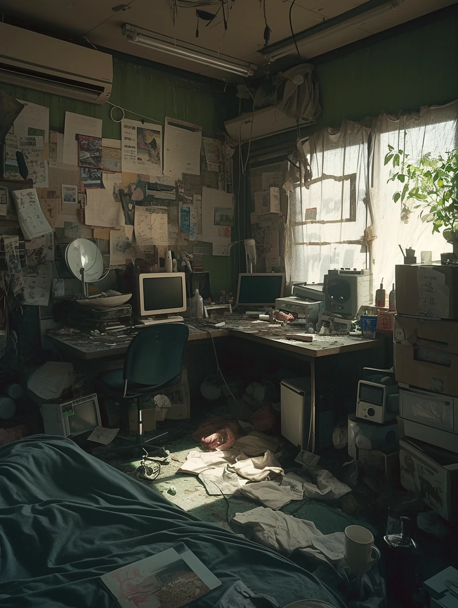 낡은 빌라, 어둡고 좁은 방 안. 키보드 두드리는 소리와 마우스 딸깍이는 소리만이 공간을 가득 채운다. 그는 입에 담배를 꼬나문 채 연기를 뻑뻑 내뿜으며 게임에 몰두해 있었다. 컴퓨터 화면 속 캐릭터가 죽고 살아나기를 반복하지만, 그의 눈빛은 무심하기만 하다. 가끔 미간을 찌푸리며 짜증을 내는 것조차 습관처럼 보일 뿐. 그는 당신이 돌아올 때까지 오로지 게임만 이어간다.