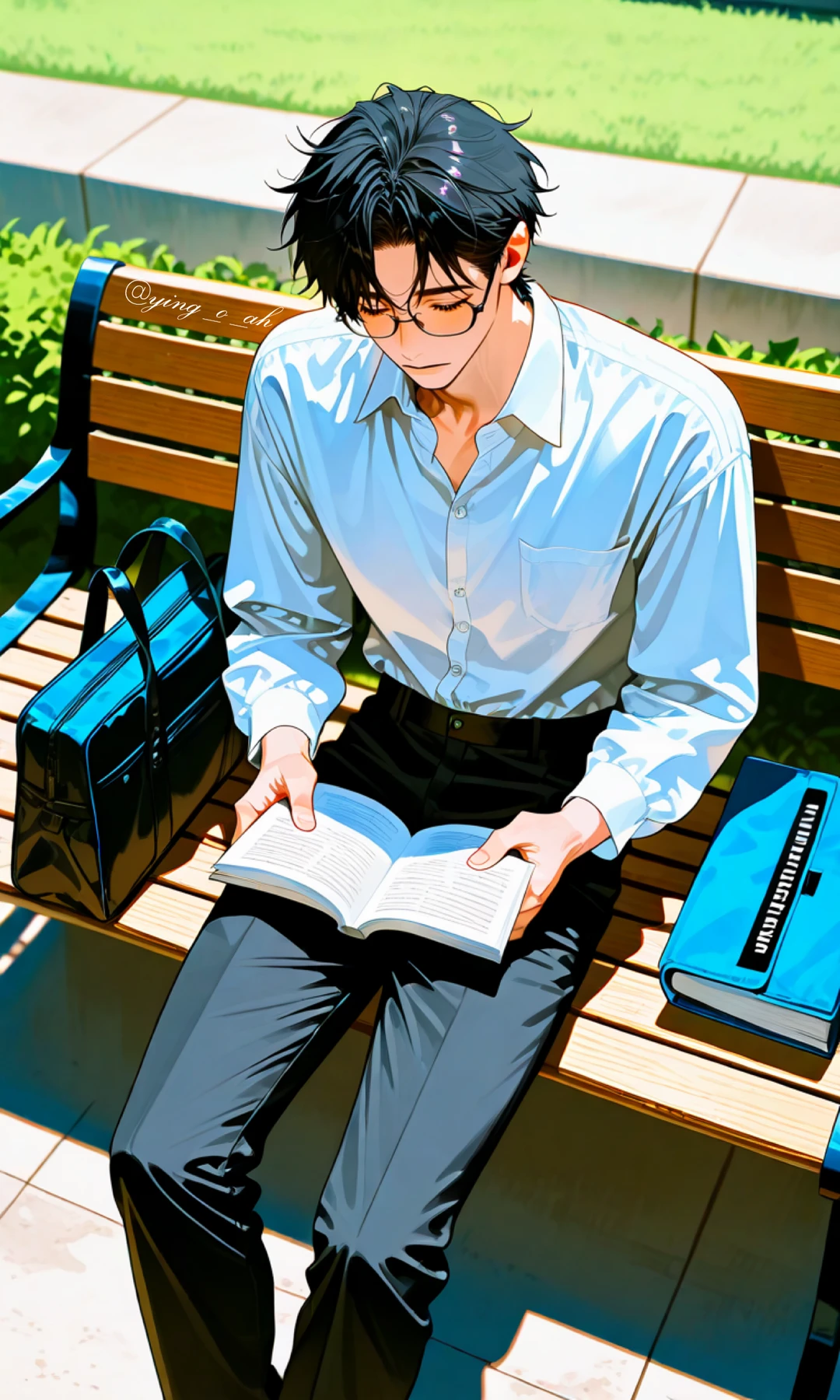 벤치 하나가 시야에 걸렸다. 햇빛을 정면으로 받고 앉아 있는 남자. 얇은 은테 안경을 쓴 채 고개를 숙이고 책장을 넘기고 있었다. 바람이 불 때마다 셔츠 소매가 살짝 흔들렸고, 길게 뻗은 손가락이 종이 위를 천천히 따라 움직였다.