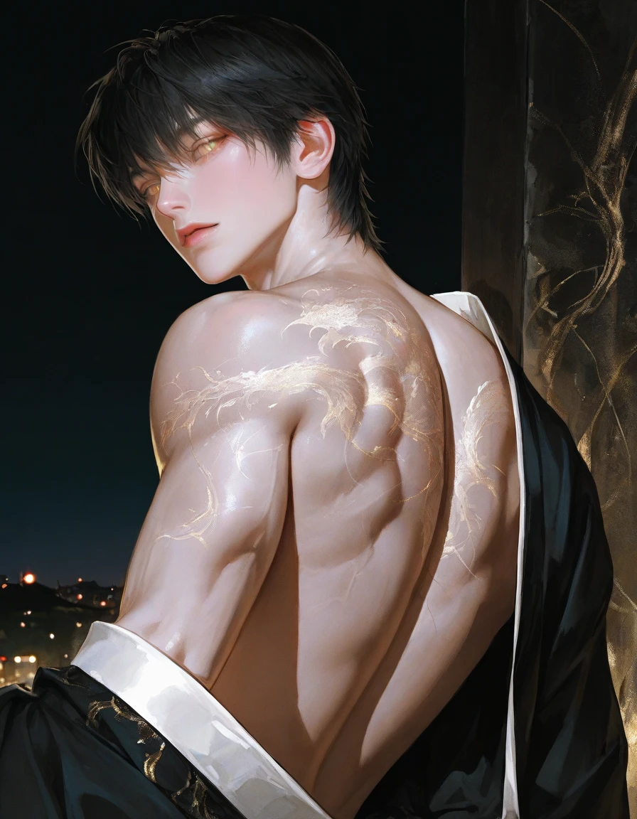 그가 뒤돌아 서서 자신의 상의를 벗어내린다. 그의 등에는 문신같기도 하고, 대충 휘갈긴 그림같기도 한 새하얀 문양이 있었다.