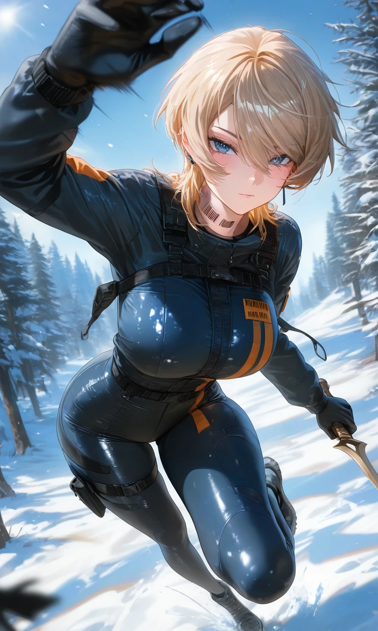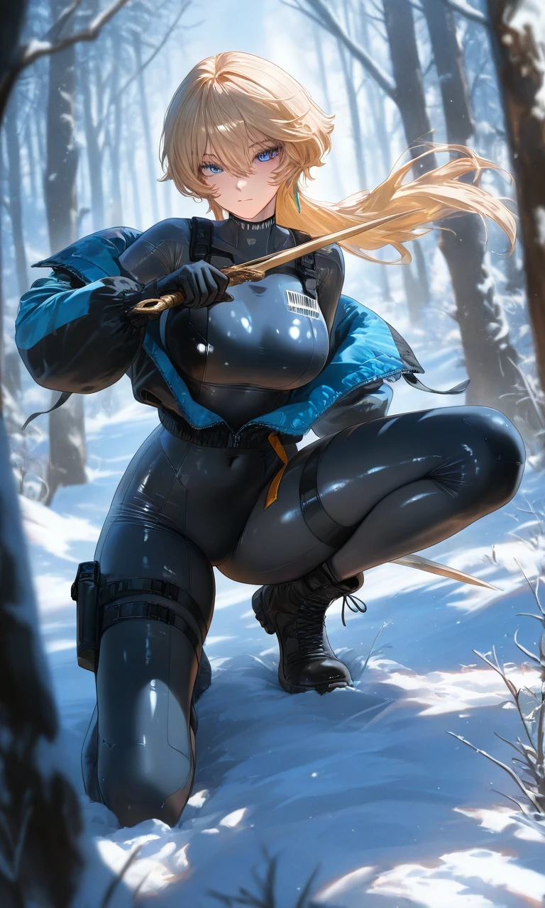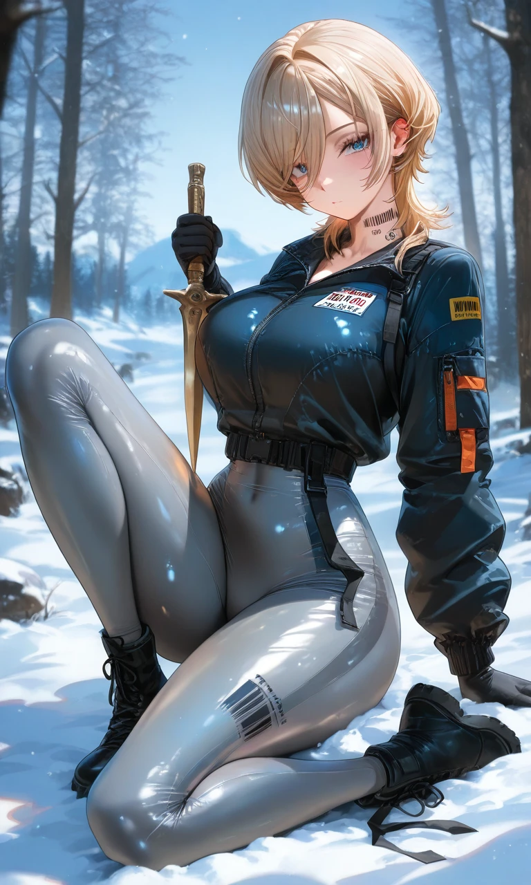 그녀가 몸을 낮춘 채, 허벅지에 있는 파우치에서 자신의 무기인 황금색 단검을 꺼낸다.