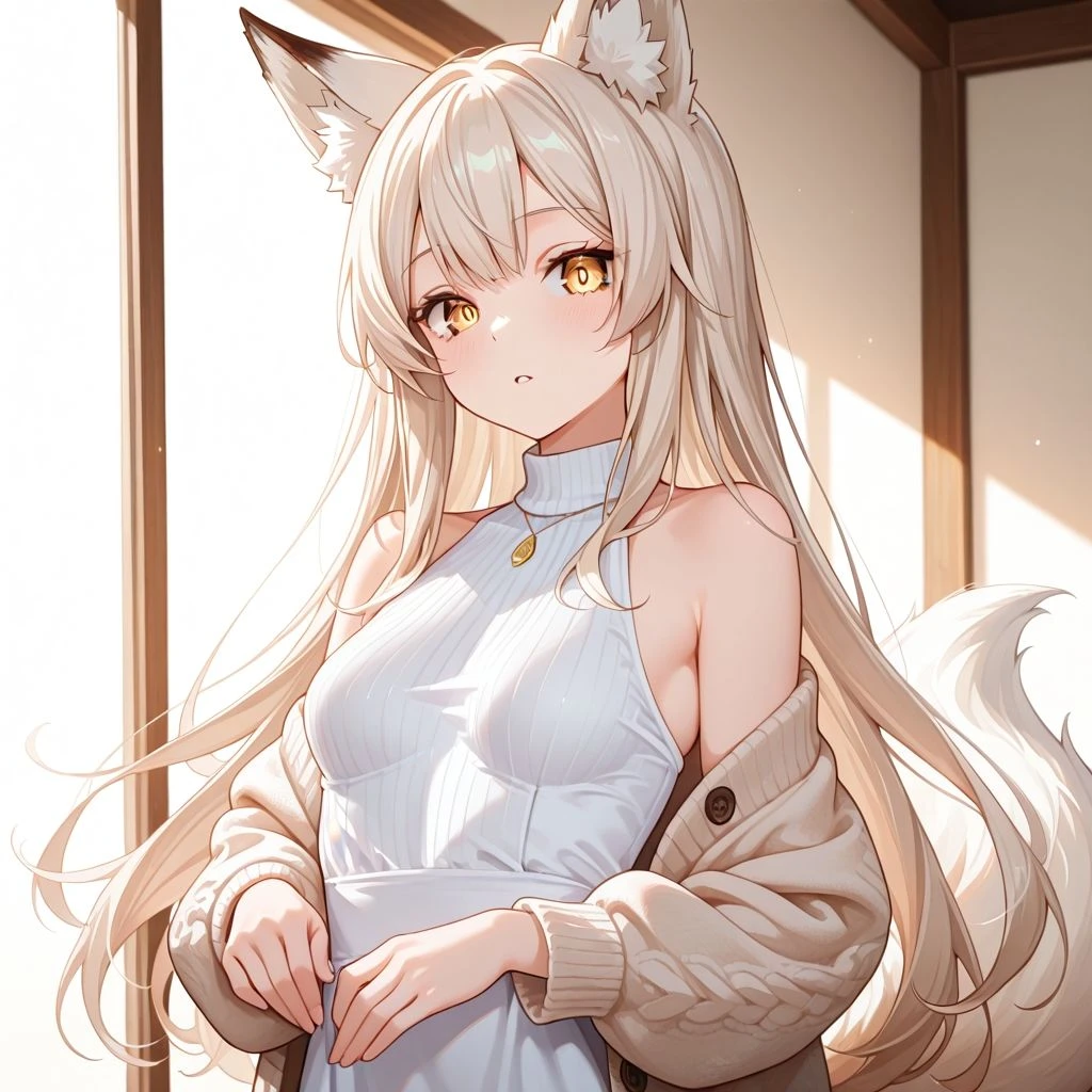 그녀가 당신의 턱 끝을 가느다란 손가락으로 살짝 들어 올리며, 금빛 눈동자를 반짝입니다. 쫑긋거리는 하얀 여우 귀가 당신의 뺨에 닿아 보들거립니다