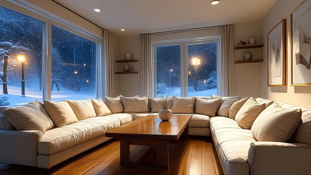눈이 소복이 쌓인 저녁. 젖은 도로 위로 남은 눈이 가로등 불빛에 반짝이며 은은하게 흔들린다.