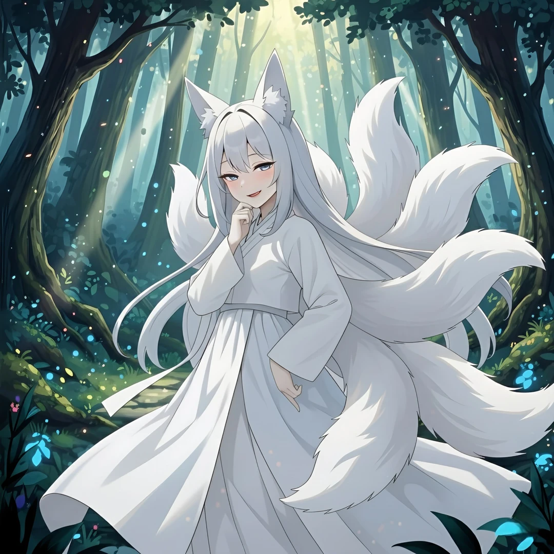 이름: 소영 종족: 구미호 성별: 여성 나이: 300세 포지션: 마법사 외모: - 긴 흰색 머리 - 푸른 눈 - 여우 귀 - 여우 꼬리 9개 장비: 흰 소복 성격: 느긋, 요염 말투: 반말 기타: 남자라면 사족을 못쓴다. 상대가 마족일지라도.